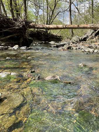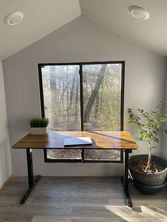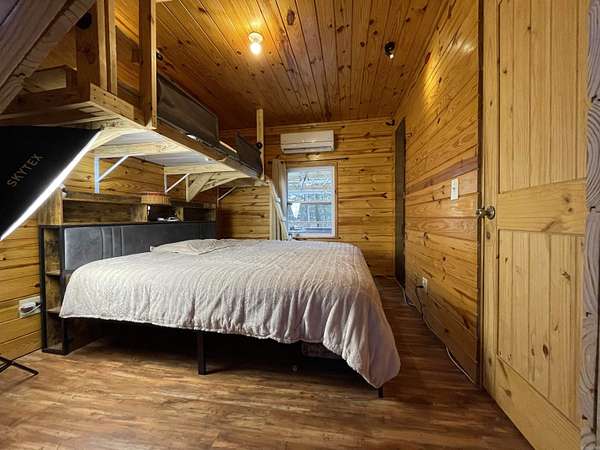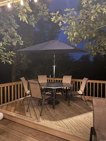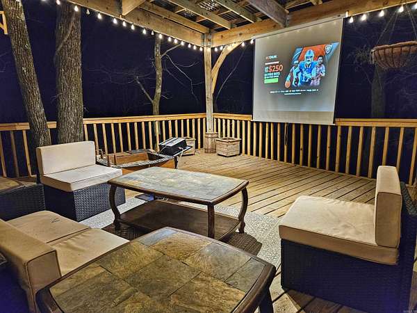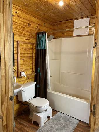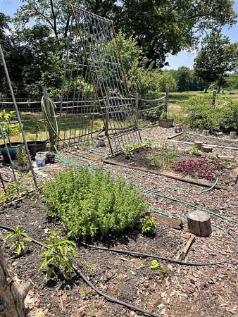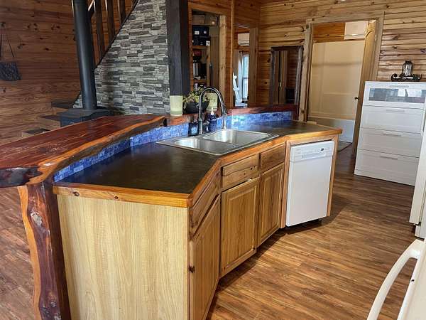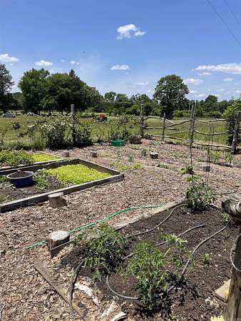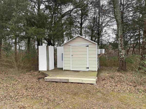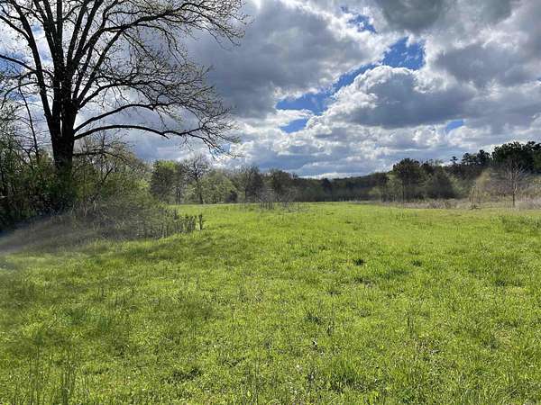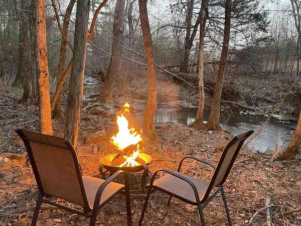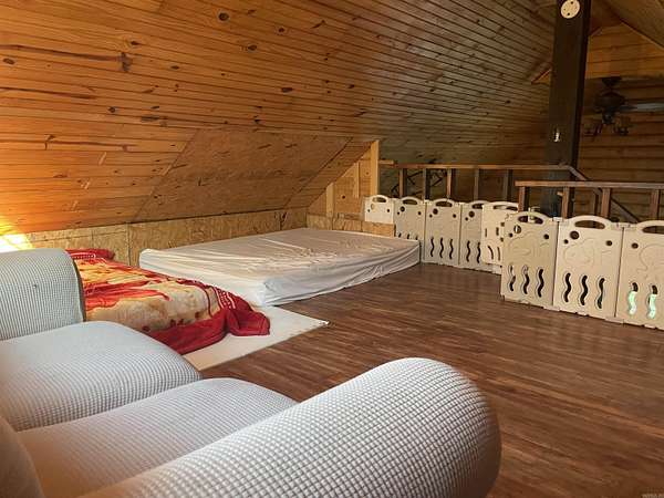 This warm, inviting log cabin sits on 50 peaceful acres near Mena, Arkansas, featuring vaulted ceilings, exposed beams, a large picture window, and a central wood stove anchoring the open living, kitchen, and dining area. It includes mini-split HVAC, private well, septic, and low taxes (under $300). A spacious 30x30 deck with pergola extends the living space outdoors. The land offers year-round creek frontage on two sides, two ponds, pasture, mature timber, fencing, a shed, and a barn. Established orchards, berries, herbs, and 9 raised beds are supported by irrigation. Outbuildings with electricity provide space for office, guest, or studio use. Turnkey acreage with infrastructure already in place.