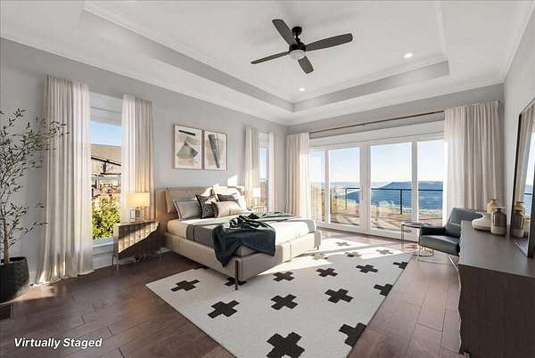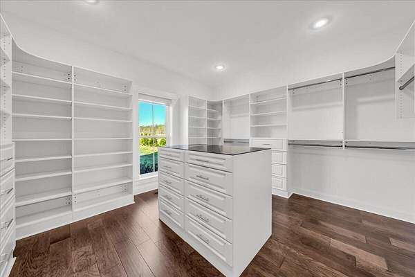 The primary suite is a sanctuary unto itself--an intimate retreat designed for comfort and indulgence. Automated blinds frame the surrounding landscape, while the spa-inspired bathroom features an oversized walk-in double shower with refined finishes. The expansive wardrobe suite, appointed with integrated cabinetry and custom dressers, offers both elegance and organization at the highest level.