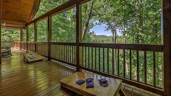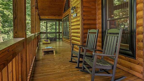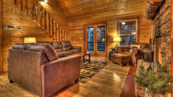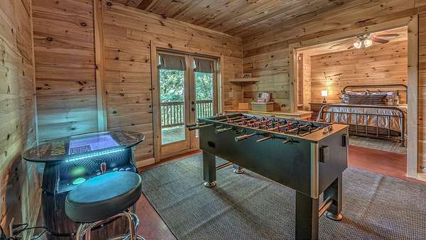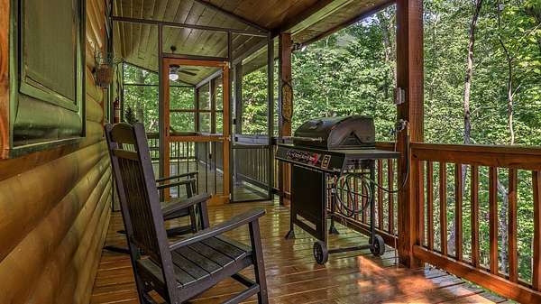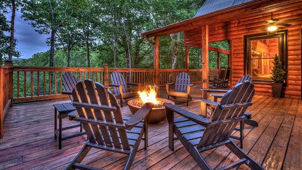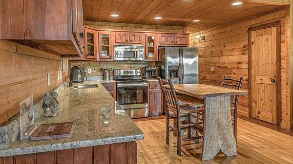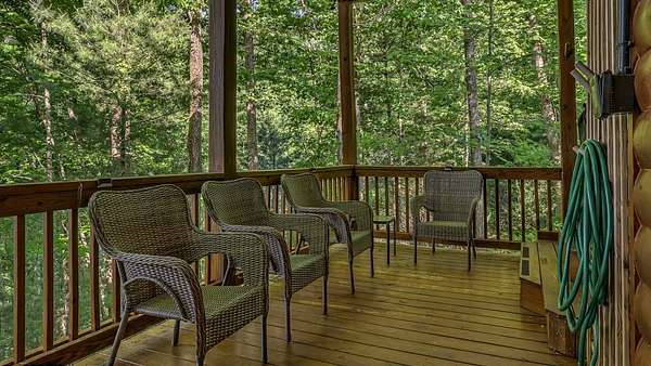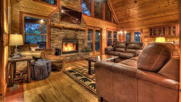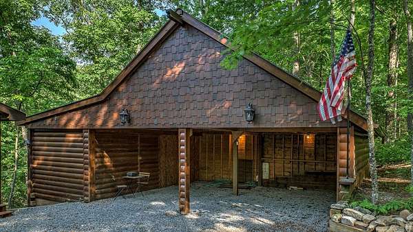 Located in the ASKA Adventure Area, this 3-bedroom, 3-bath log-sided cabin sits on a private wooded lot with mountain views and it located just minutes from the Toccoa River, Fall Creek Falls hiking trails, Mountain Biking and More. The main level features an open great room and dining area with a gas stoned fireplace, creating a central living space. The kitchen offers ample cabinetry, granite countertops, and a bar for casual seating. The primary bedroom is located on the main level and opens to a sleeping balcony porch. The ensuite bathroom includes a clawfoot tub, walk-in shower, and large closets. The fully finished terrace level provides additional living space with a 3rd bedroom, a full bath, and a den/rec room with direct access to the lower patio and hot tub. Outdoor areas include a fire pit and multiple porches and patios for outdoor use.A large circular driveway allows for easy access and parking. The double carport/garage includes a workshop and additional storage space above. Homes is currently a Short Term Rental with Future bookings.