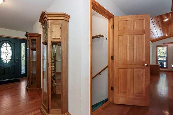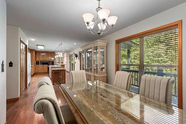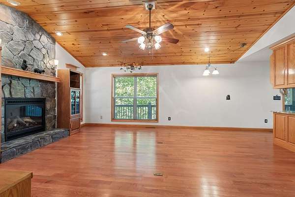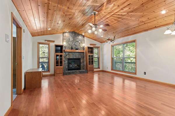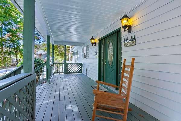 Welcome to your mountain home in the gated Wolf Mountain Estates community -- a peaceful, wooded sanctuary offering comfort, space, and privacy. This partially furnished 4-bedroom, 3-bathroom home sits on two wooded lots totaling over two acres. Enjoy parking right at the front door or in the spacious 23' x 26' basement double garage. A full-length front porch and decks welcome you, with decks wrapping around all four sides of the home, and a second porch on the back showcasing soothing forest and gorgeous mountain views. Step inside through a beautiful beveled glass front door into a warm and inviting foyer. Just off the entry is a convenient laundry room with built-in cabinets and shelving, adjoining a full guest bathroom with a granite-topped vanity and vessel sink. The Great Room features rich wood floors, a soaring vaulted tongue-and-groove ceiling, and a floor-to-ceiling stone gas-log fireplace with cabinets on both sides. The open layout flows into the kitchen and dining area, where you'll find abundant granite counter space, a massive three-tier island, and two sliding glass doors leading to the back porch. The dining area, surrounded by windows, brings the forest indoors with every meal. The main-level Master Suite offers generous space and a luxurious en suite bathroom with dual vessel sinks on a granite vanity, a jetted garden tub, and a separate step-in shower. The first of three guest bedrooms is off the Great Room and completes the main level. Downstairs, the lower level has a large recreation room with a tongue-and-groove ceiling and sliding glass doors leading outside, plus two guest bedrooms - one with porch access - and a full bathroom. A door from the recreation room leads to the double garage that has a convenient utility sink, and the mechanical room. Outside, a storage shed adds even more space and convenience. This charming home blends rustic elegance with modern comfort. Welcome to desirable Wolf Mountain Estates.