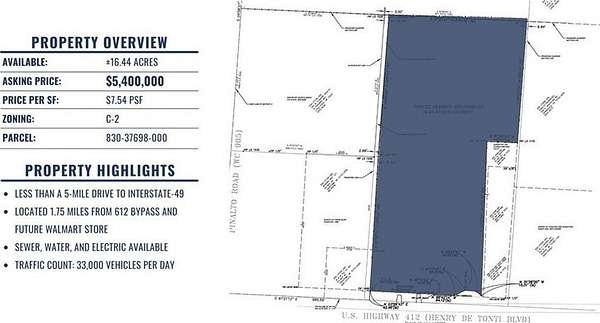 Est $39,377/moLess than a 5-mile drive to I-49. Located 1.75 miles from the 612 bypass and the future Walmart. Sewer, water, and electricity are available. Traffic count: 33,000 vehicles per day.