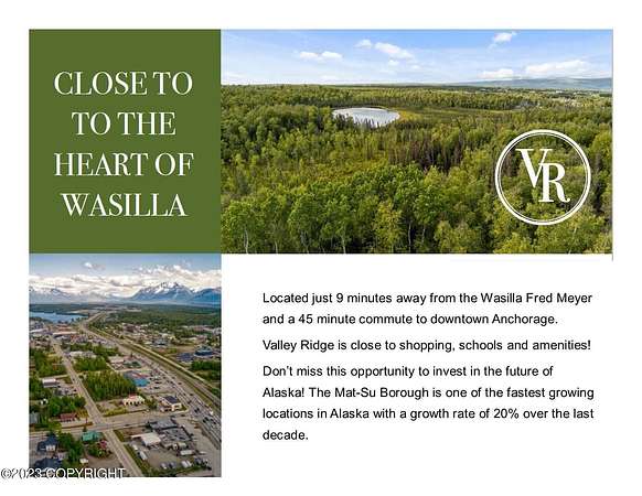 A Must see! Over 600-ft wide! 1.22 acres just minutes from Lucille Lake and Park in a newer subdivision Valley Ridge! 5 minutes to the heart of Wasilla and 45 mins to downtown Anchorage. See document tab for copies of the CCR's, TOPO, and Plat.