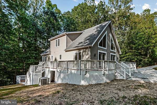 Welcome to this stunning updated A-frame retreat offering over 3,000 square feet of living space and situated on just under two acres. The home greets you with a massive wraparound deck-perfect for entertaining or simply enjoying the peaceful natural surroundings. Inside, you'll find soaring ceilings with beautiful exposed beams and an abundance of natural light throughout. The main level features a spacious primary suite with its own luxurious ensuite bath complete with a soaking tub. Upstairs and on the lower level, you'll find three additional bedrooms and three full bathrooms, providing comfort and privacy for family and guests alike. This unique home combines modern updates with timeless charm, offering the perfect balance of character and functionality. As part of the sought-after community, you'll also enjoy exclusive amenities including a private beach on Lake Anna and access to a community dock where boat slips can be reserved. Whether you're seeking a full-time residence or a weekend lake escape, this property delivers the ideal combination of space, style, and location.