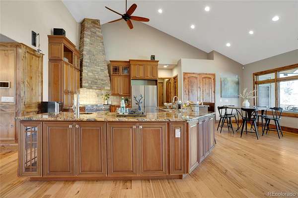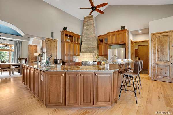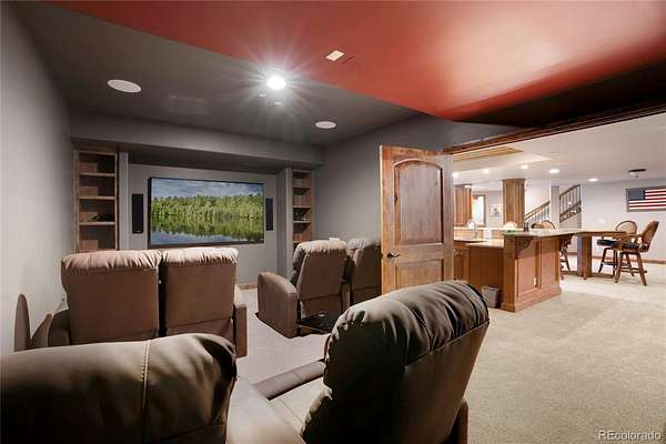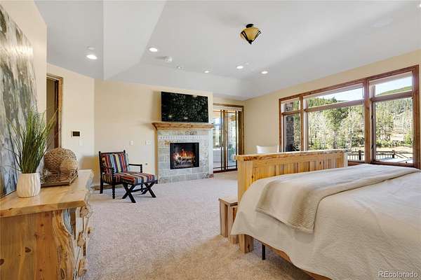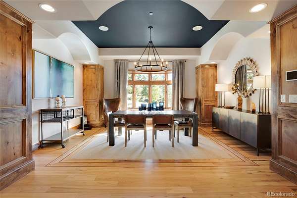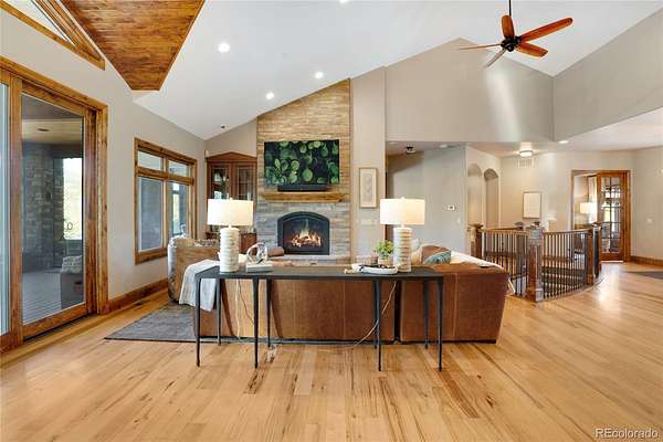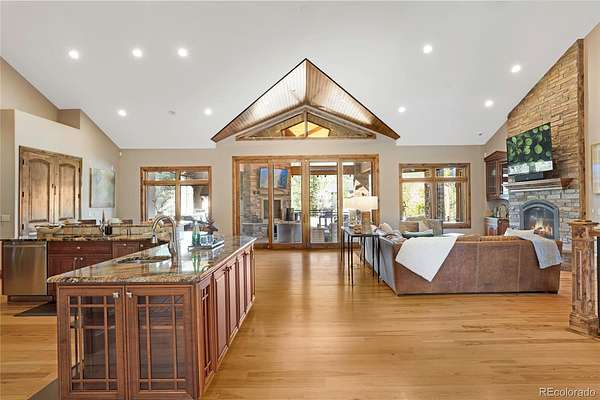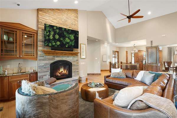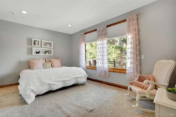 A true Colorado masterpiece with spectacular mountain views, ideally located just five minutes from Evergreen on a rare flat, meadowed lot. This exceptional walkout ranch blends luxury, comfort, and functionality with soaring vaulted ceilings, expansive windows, and one-of-a-kind finishes throughout. The gourmet island kitchen opens seamlessly to the family room and dining area, creating an ideal setting for both everyday living and elevated entertaining. Exceptional amenities include a spacious wine room, beautifully finished theater/media room, tranquil water features in both the front and back of the home, and a hot tub perfectly positioned to take in the surrounding natural beauty. A stunning indoor/outdoor living addition features glass doors, a fireplace, a built-in BBQ, bar space, and generous seating for year-round enjoyment. The expansive primary suite offers room for substantial furnishings and extensive closet space. Spa-like primary bathroom with soaking tub and steam shower. The property also includes an attached three-car garage plus an incredible 2,500-square-foot heated RV garage. Near Elk Meadow Park with easy access to trails, wildlife, and recreation, this is luxury Colorado living at its finest.