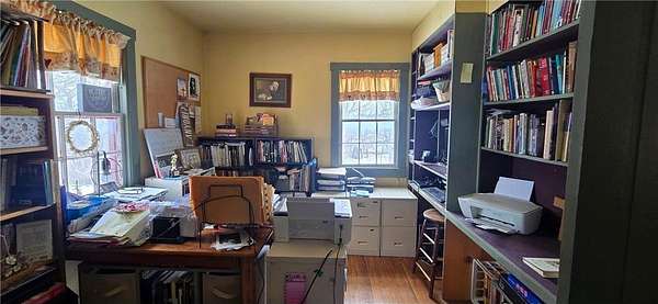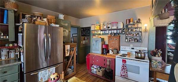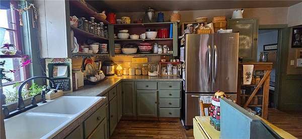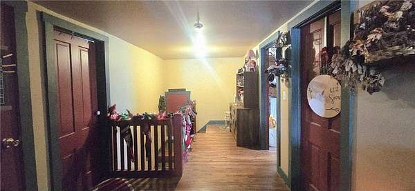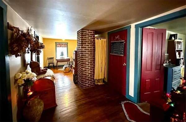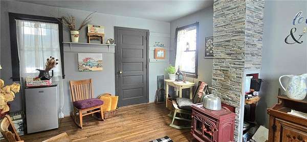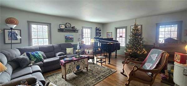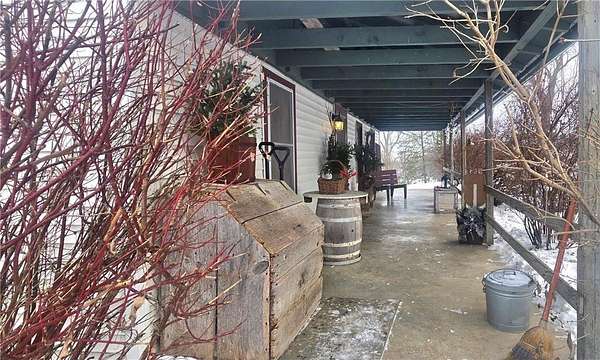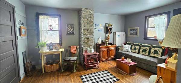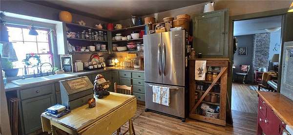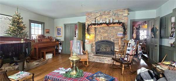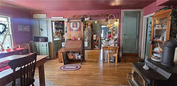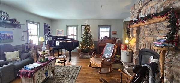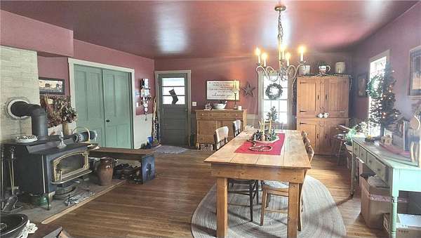 A Homestead That Feels Like a Warm Hug. Welcome to a place where life slows down, food is grown with intention, and every season brings something to enjoy! This 15-acre homestead offers a beautiful mix of rolling pasture, wooded land, and organically productive crop space--from apple trees to large gardens--perfectly imperfect for buyers dreaming of a truly grounded lifestyle. The 5-bedroom, 2-bath farmhouse welcomes you with a covered front porch and an expansive screened-in back room--ideal for summer evenings and morning coffee. Inside, warmth of the wood stove in the dining room is inviting to all or cozy up by the beautiful stone gas fireplace in the living room. An additional freestanding gas fireplace in the main-level livingroom to enjoy some quiet time. The kitchen's open shelving evokes the charm of yesteryear, blending functionality with farmhouse appeal. A main-floor bedroom offers flexible living options (currently an office), while upstairs you'll find four additional bedrooms, a full bath with laundry, and a walk-up attic providing generous storage space. The lower level is designed for gathering and creativity, featuring a family room, theatre room, storage areas, and a dedicated canning cellar.