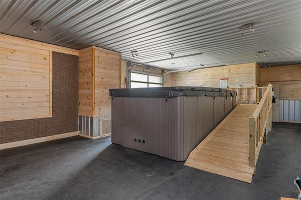 The secondary building is designed for horse lovers with 7 extra-large stalls, 2 bathrooms, rustic living quarters with pine-accented walls, a full kitchen, game room, bunk room, tack room, and spacious hay storage. Additional concrete-floored barn stalls increase boarding capacity.