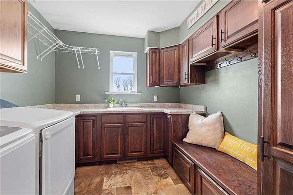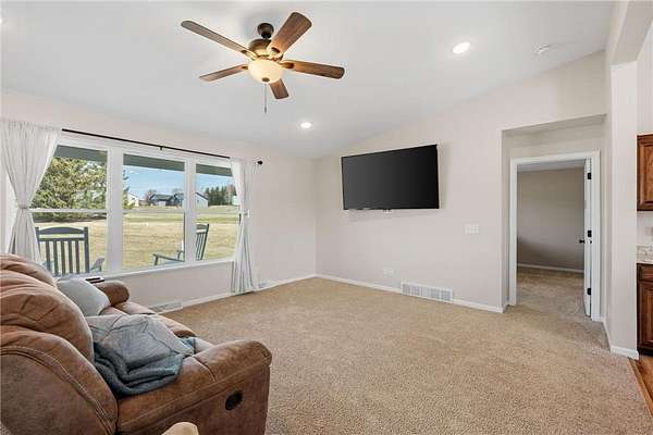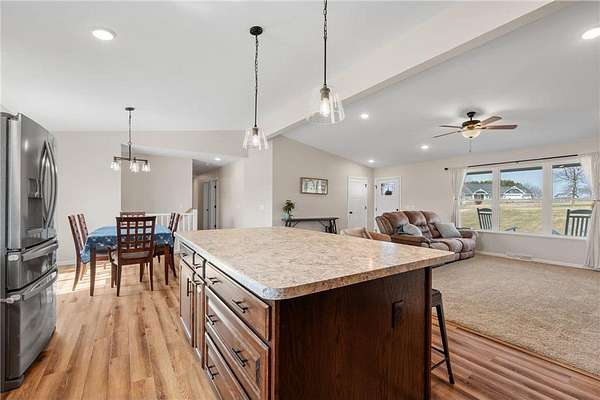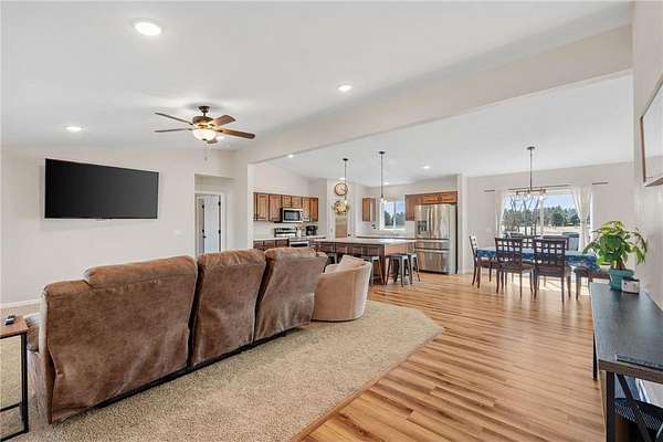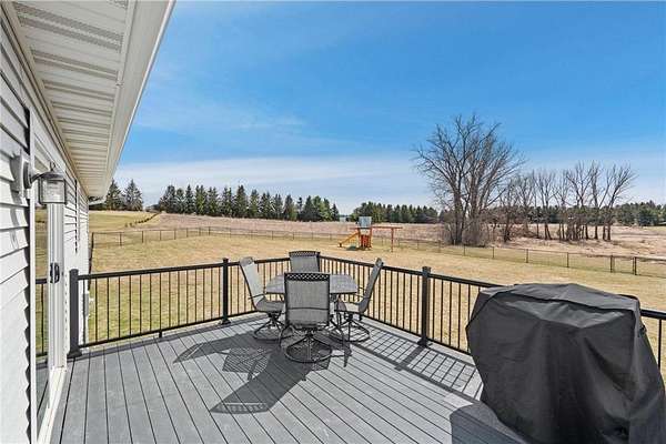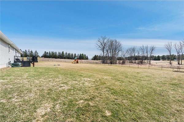 Welcome to this beautiful rambler situated on 1.9 acres in the highly desired Cherry Hills neighborhood of New Richmond. Enter the home and appreciate the abundance of natural light in the open main floor living space. The living room is spacious and features vaulted ceilings and views of the front yard. The kitchen features a huge center island, walk-in pantry, stainless steel appliances, and south facing pond views. The adjacent dining space also offers access to the deck with metal railings and maintenance free composite decking. Enjoy the convenience of a main floor master suite that features a big walk-in closet and private master bath with dual vanities, jetted tub, walk-in shower, and built-in linen cabinets. Also on the main floor are two additional bedrooms and full bathroom. The large walk-in closet in the hallway offers plenty of space for storage, linens, or extra pantry space. Don’t miss the laundry room which features and abundance of built-in cabinetry and includes a bench space, sink, countertops, and south facing views. This home also has a huge unfinished basement that has roughed in plumbing for an additional bathroom. Out back is the huge backyard that abuts the pond that brings in wildlife. The backyard is fully fenced in and includes the Rainbow playset. This home is clean, turnkey, and ready for you to move in!