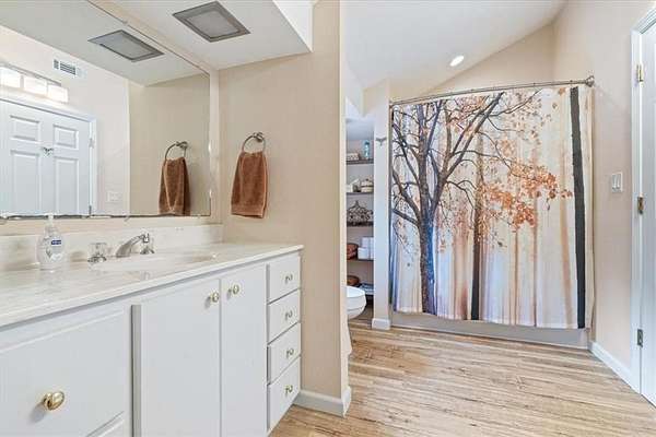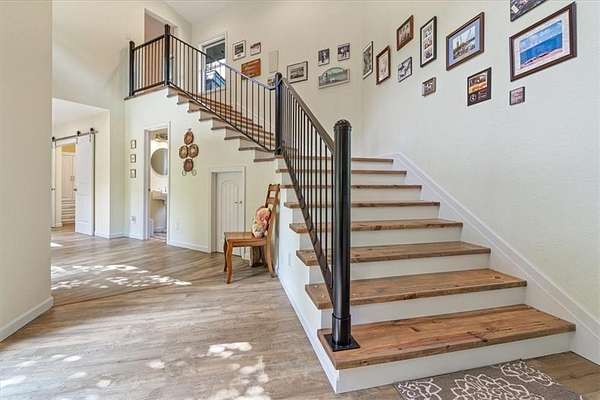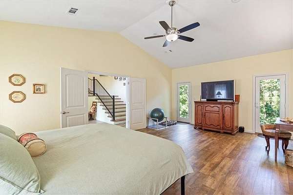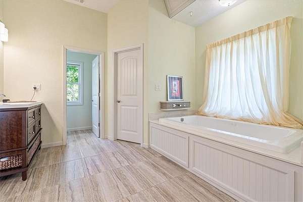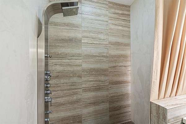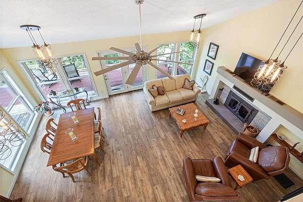 (excluding the upstairs bathroom). Custom stairs, kitchen bar, and forced air wood burning fireplace. Large 330 SF primary bedroom and 264 SF primary bath w/ jetted tub, custom 22 SF shower w/ rain head and 8 jets, 2 vanities, 2 walk-in closets, and separate toilet room. Luxury vinyl and tile throughout. All windows are Anderson double hung tilt-in. Kitchen has