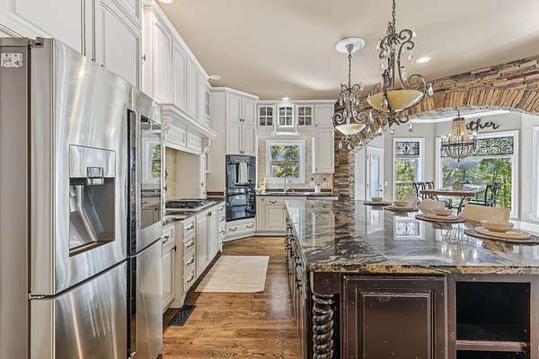The kitchen? Let's talk. A huge island, breakfast bar, stone fireplace (because one fireplace just isn't enough), tons of counter space, and a cozy bay-windowed eat-in area. Basically, this kitchen can handle everything from quiet coffee mornings to hosting Thanksgiving for your entire zip code.