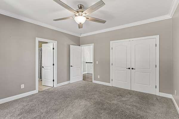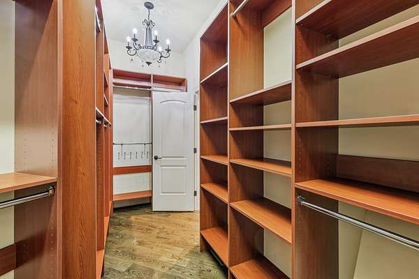 Architectural details like elegant arches and stone accents give the home serious character, while the main-level primary suite is straight-up spa vibes. Dual shower. Soaking tub. Two vanities. His and hers walk-in closets with custom built-ins AND a safe in each closet because luxury deserves security.