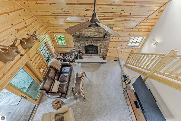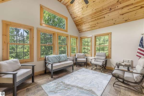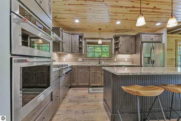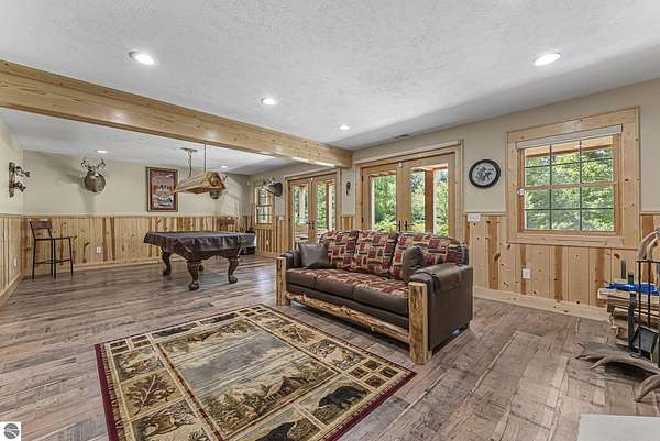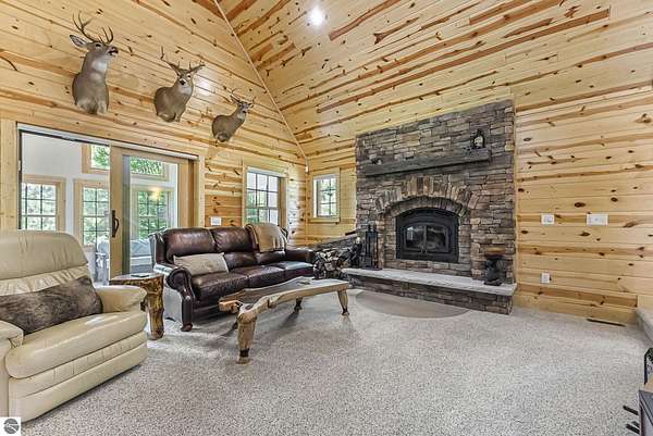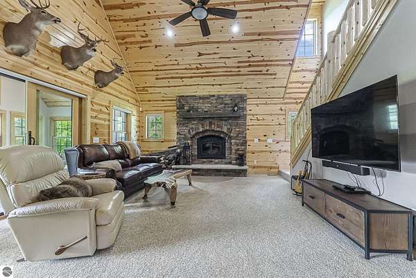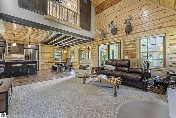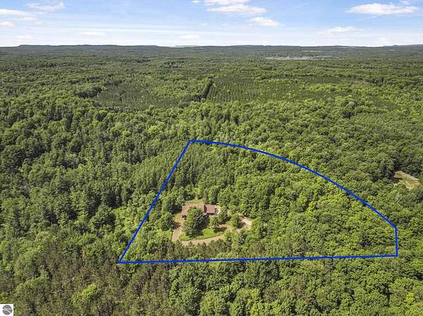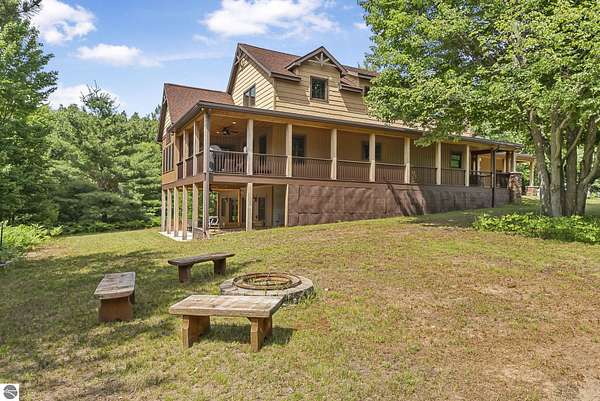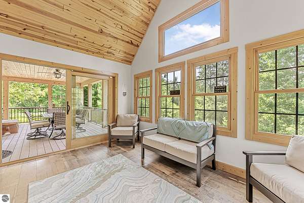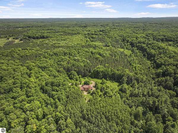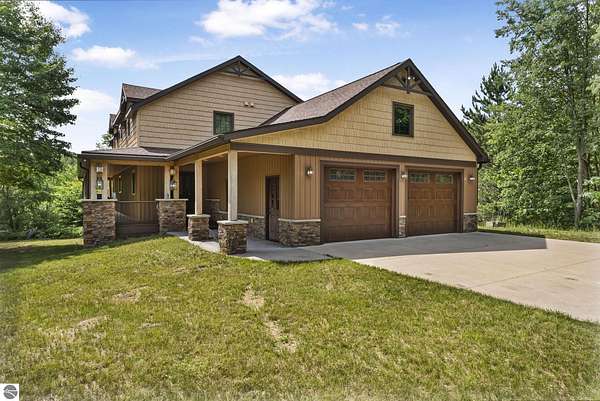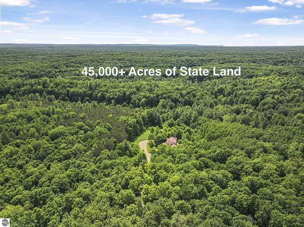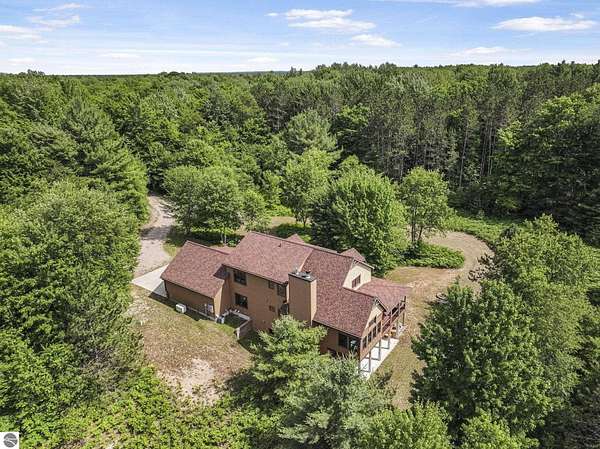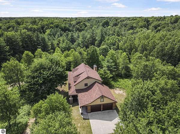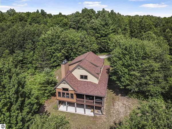 Surrounded by over 45,000 acres of pristine Michigan State land , this custom-built 2019 home in Lake Ann is the ultimate "up north" retreat. Whether you're seeking a year-round residence, seasonal escape, or recreational haven, this 5 bedroom, 5 bath home offers unmatched privacy and outdoor opportunity-ideal for hunting, hiking, ORV riding, snowmobiling and more. This is so thoughtfully designed from a main floor covered deck and a beautiful three-season sunroom that offers both the feeling of bringing the outside in as you relax and enjoy the quiet nature views in a covered living space. Solid pine doors, ceilings and trim detail will grab your attention the minute you enter this beautiful home as every inch exudes warmth and craftsmanship. The elegant quartzite countertops thorough-out elevate the aesthetic, blending the rustic charm with modern luxury. A stunning combination. Enjoy the custom kitchen, cozy up next to one of two fireplaces, or head downstairs to the finished walkout lower level with a pool table area and large second family living space perfect for entertaining. This is set in a truly remarkable location with endless recreational potential, offering peaceful serenity when you need to get away, style and adventure all in one.