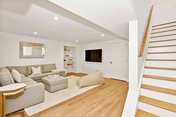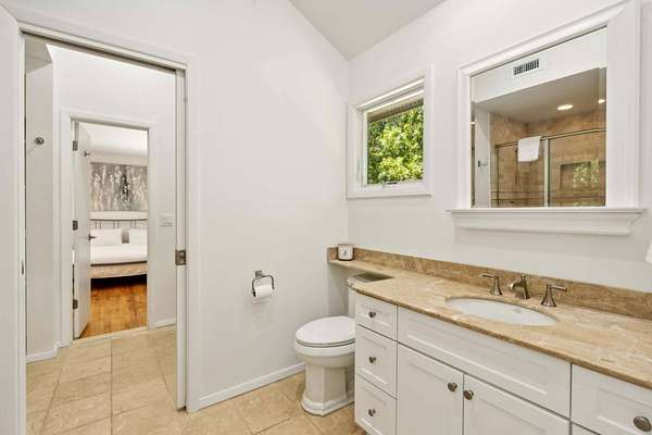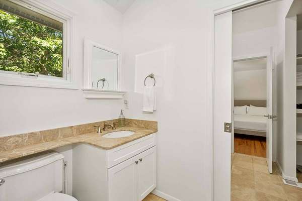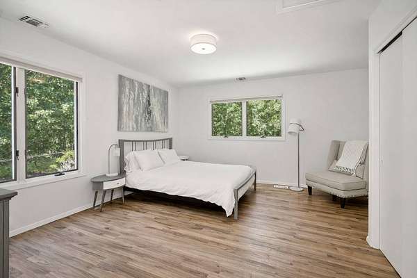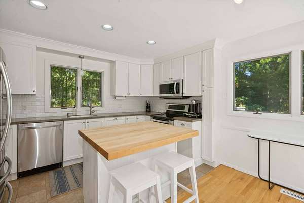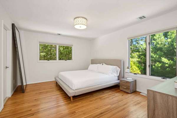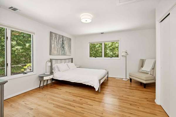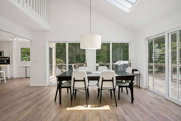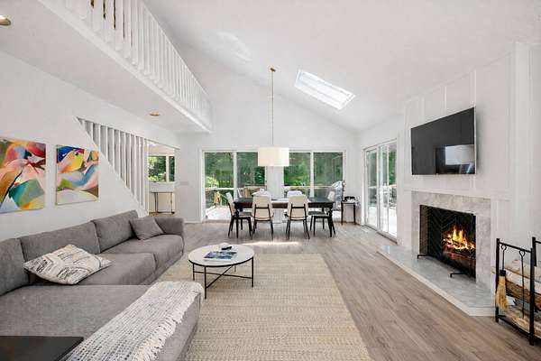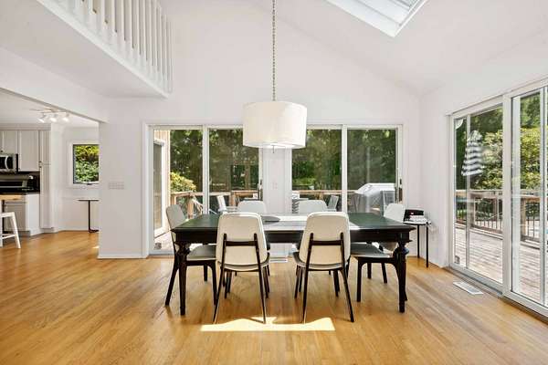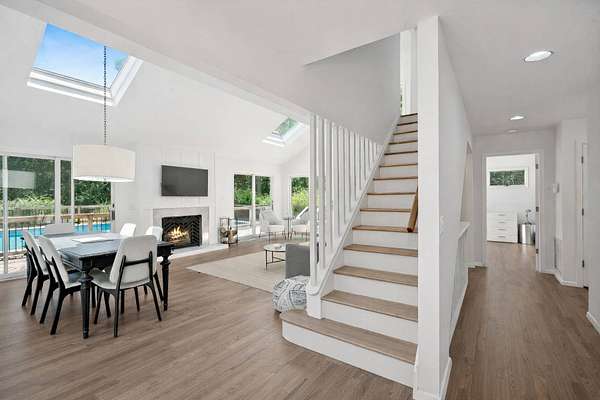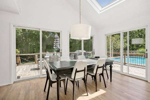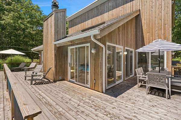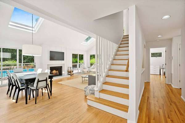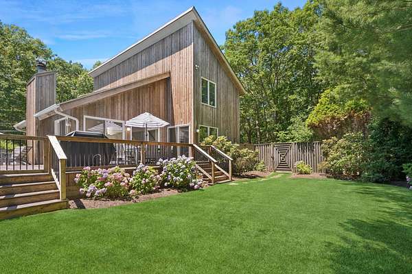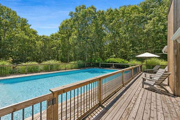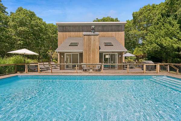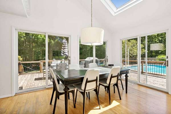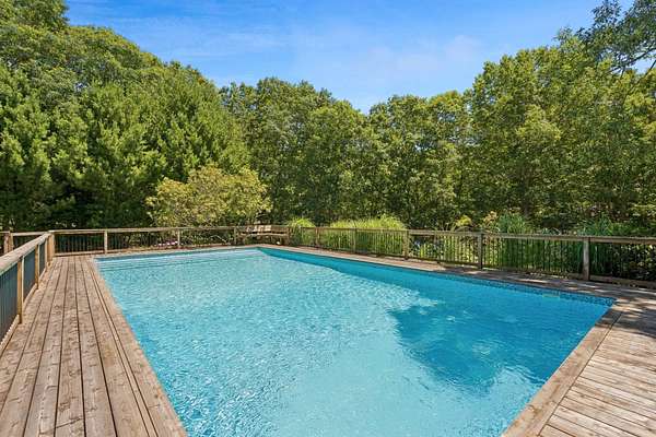 Light-filled estate on 1.56 private acres, recently upgraded with a finished lower level and boasting a heated pool. Easy luxury living awaits on 2,750 +/- sq. ft. of space with 4 bedrooms and 4 baths, plus a full floor renovation, new HVAC, and new pool heater/equipment. Interiors beam with light across gorgeous hardwood floors, while multiple sliding glass doors bring the outside in. Open living areas include a 3-exposure living room with tall ceilings and fireplace, a dining area with glass doors to the deck and pool area, both fenced and a kitchen with island seating and stainless appliances. All bedrooms are well-sized and accommodating, including the ensuite primary suite with a glass shower and marble vanity. As a bonus, there is a large additional den, and a separate office area. The lower level is ready for year-round enjoyment with added living space to suit your needs. Enjoy the heated pool, barbecue, entertain, or dine al fresco on the deck. Additional amenities include a putting green, outdoor shower, and gated yard. Located minutes from ocean beaches, Sag Harbor Village, Sagaponack, Bridgehampton, and Wainscott.