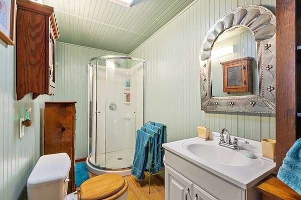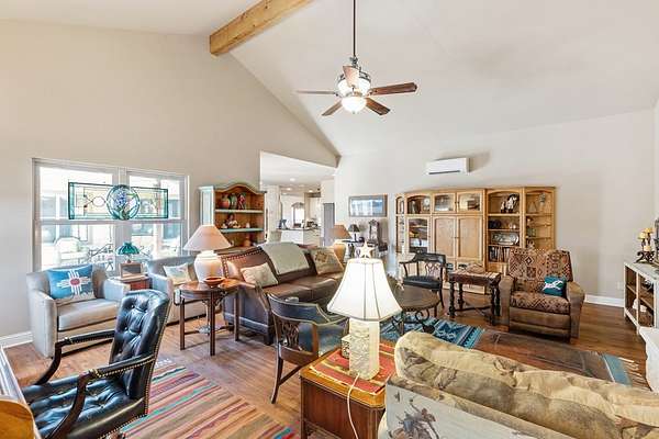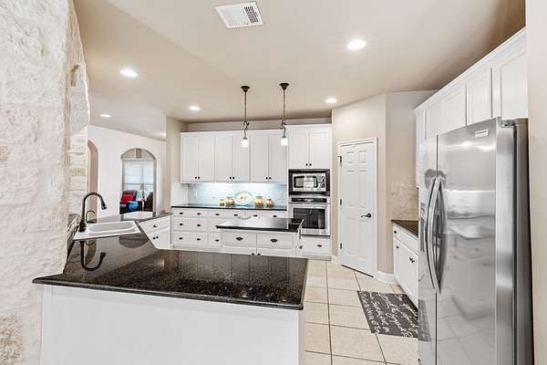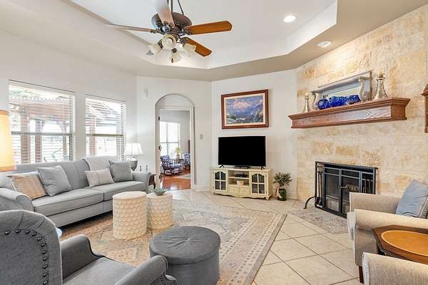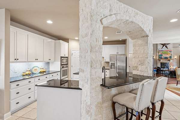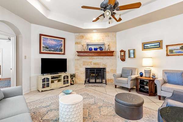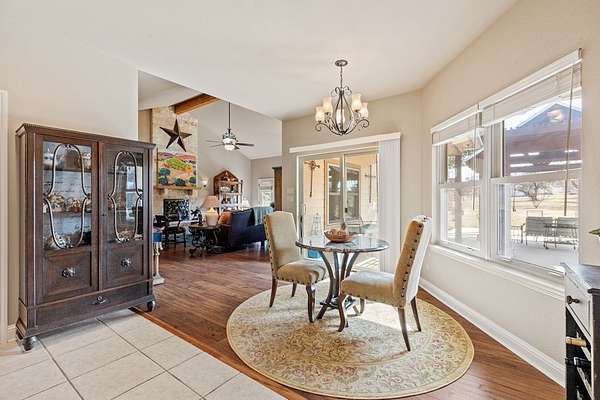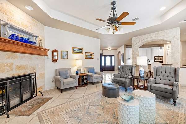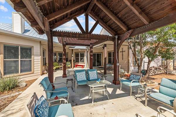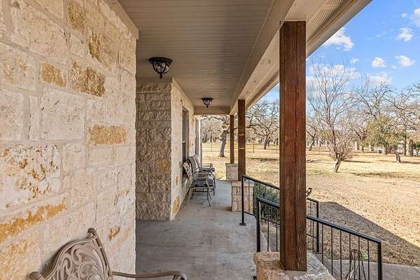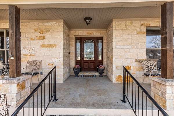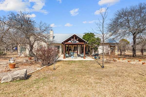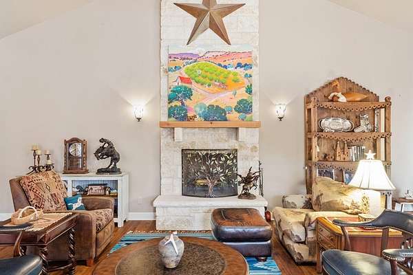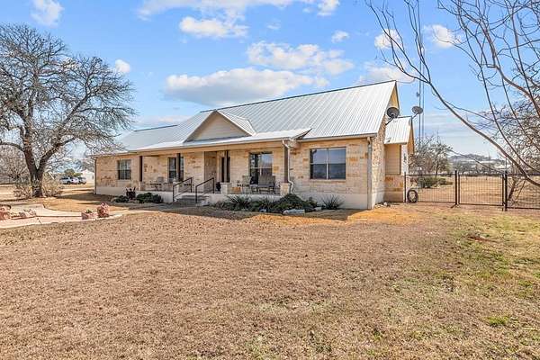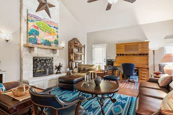 Custom Energy Star Home by J. Long on 3 Beautiful Acres only six miles from historic Fredericksburg, Texas. Enjoy this stunning custom-built Energy Star home featuring 3 bedrooms, 2 baths, a private study, and formal dining room -- thoughtfully designed with both comfort and elegance in mind. The open-concept layout showcases gorgeous stone arches framing the kitchen and living area complete with a stone fireplace, flowing seamlessly into a spacious great room highlighted by a second beautiful limestone fireplace. The kitchen is a chef's dream with granite countertops, an eat-at bar, large island, abundant cabinetry, generous counter space and a breakfast nook. Wood floors add warmth and sophistication to the study, formal dining room, and primary suite. Soaring 9-10 foot ceilings throughout create an airy, expansive feel. The primary suite offers a relaxing retreat with dual sinks, a garden tub, separate shower, and a large walk-in closet. Bedrooms 2 and 3 feature private vanity areas and share a convenient Jack-and-Jill bathroom. A very large utility room provides ample space for crafts, hobbies, or even a home office. Step outside to enjoy mature landscaping, native wildlife, a beautifully manicured 3-acre property, and a spacious outdoor entertaining area perfect for gatherings. Imagine the spectacular sunsets and starry night skies only visible from rural properties. The property also includes a fully equipped guest house with living space, full kitchen, bedroom, and bathroom. Behind the guest house is a two-sided enclosure ideal for tools, vehicles, or equipment plus additional storage space. This exceptional property offers privacy, functionality, and timeless design -- all in one incredible setting