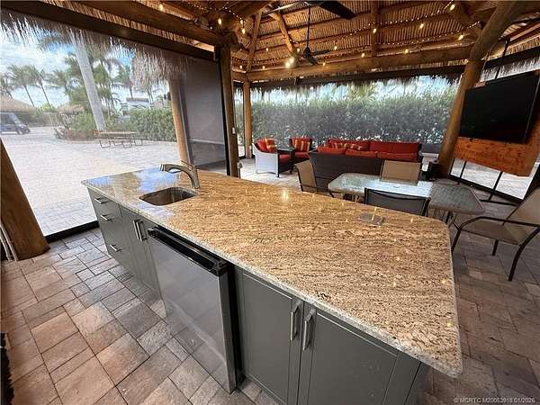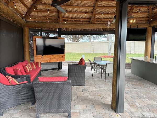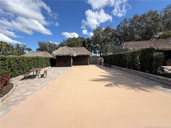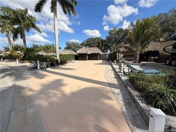 An oversized 3,334 sq ft lot offering refined resort-style living in a premier Class A motorcoach community. This enhanced property features a custom tiki hut with remote-controlled screens and a marine-grade granite kitchen complete with hot water, upgraded fans, and an eye-level wall-mounted TV-ideal for elegant entertaining or relaxed evenings under the stars. The extra-long pad provides generous parking in front of the coach, while additional side width allows effortless golf cart access without the need to back up. Set on a picturesque, mature royal palm-lined street within one of the nation's top-rated luxury motorcoach resorts, this one ticks the boxes. Dog lovers will appreciate the green space in the rear. Amenities include pickleball and tennis courts, bocce ball, shuffleboard, a par-3 executive golf course, 4 pools/spas and a vibrant clubhouse hosting year-round social events-all included in the HOA. Sold furnished and move in ready, just bring your coach and join the fun!