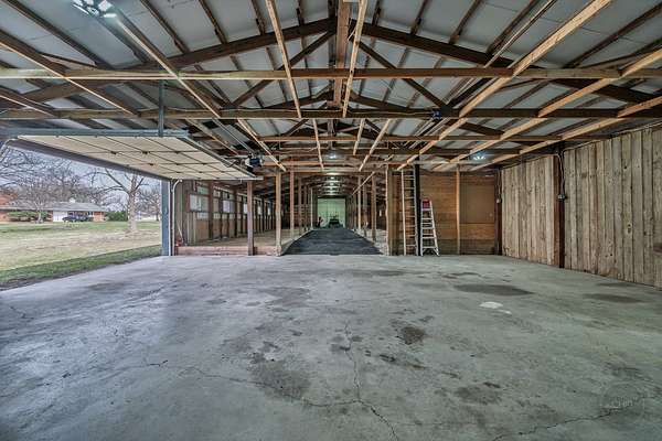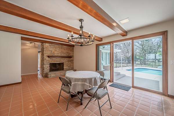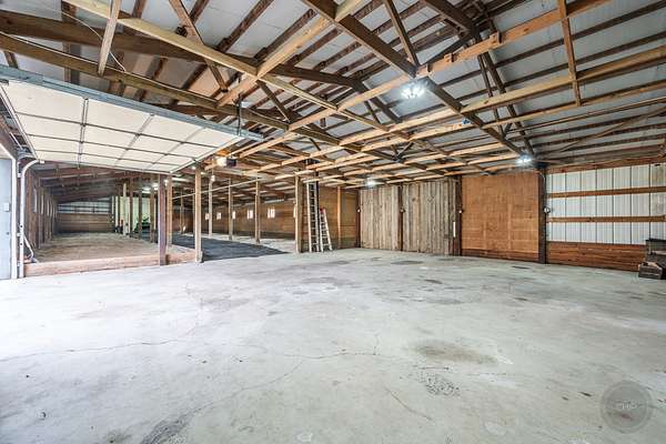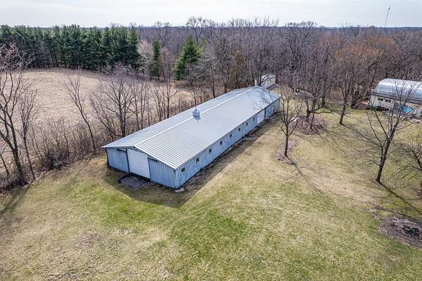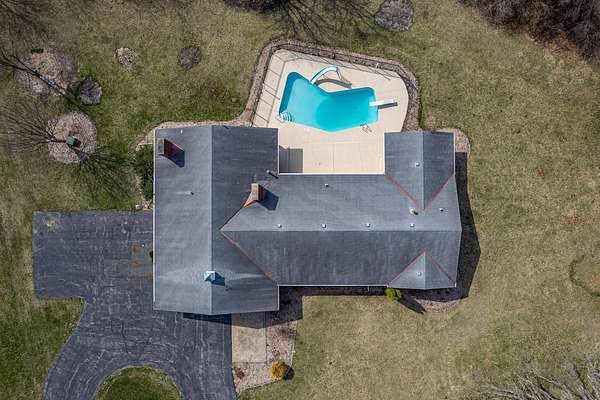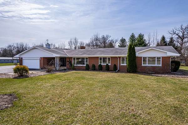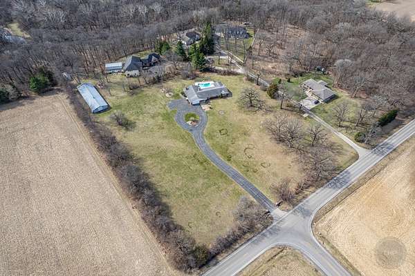 Experience refined country living in this exceptional custom all brick ranch estate, previously part of a historic equestrian Polo Farm, gracefully set on 5+ private acres of picturesque land. Blending timeless craftsmanship with elevated comfort, this expansive residence offers a rare combination of space, privacy, and versatility. From the moment you arrive, the estate captivates with its stunning curb appeal, highlighted by several 100-year-old oak trees, lighted entrance pillars, winding circle drive and an inviting oversized covered front porch. Superior Americana craftsmanship in the mid-century modern style is captivating. Inside, you will find over 3,700 sf of living space. The large entry foyer leads to a living room featuring a large picture window overlooking the property and allowing an abundance of natural lighting. Spacious kitchen showcases newer stainless-steel appliances, open shelving, and an abundance of upper and lower cabinets! The kitchen offers unique built-in accessories, providing ample counter space. Solid wood beams add a charming feel to this room along with the stone fireplace. The family room offers the perfect place to gather featuring a second fireplace, custom built-in bookcases, cabinetry, and a wet bar, hardwood floors and so much more. Off the family room is a true four-season room with access to the outside patio. This sprawling ranch includes 4 spacious bedrooms, an office and 3 full bathrooms. All new carpet throughout and freshly painted! Main floor laundry room with newer machines as well as a sink, folding counter and built-in ironing board. For even more space the 8' deep full basement will impress at an incredible 3770sf! Multiple storage rooms with floor-to-ceiling shelving available in the basement, which could easily be used as a private wine cellar. The basement also has an additional half bathroom. Outdoors, the property offers a peaceful retreat. A beautifully updated in-ground pool serves as the centerpiece for entertaining, complemented by a fenced patio designed for intimate gatherings complete with a built-in gas grill for effortless outdoor dining. Surrounded by open land and natural beauty, the setting offers both serenity and exclusivity. Adding to the estate's unique appeal is the impressive, metal outbuilding at 4550sf! Horses allowed! Two separate overhead garage doors for easy access for large vehicles or equipment. Asphalt drive through outbuilding with natural floors on the sides ready for horse stalls. Large concrete floor shop area with rooms for offices or storage. Kitchen sink and full bathroom (requires reconnecting water hookup) perfect for a workshop, business operations, creative studio, or even a golf simulator! This one-of-a-kind unique historical property combines rural charm with modern convenience, creating a rare opportunity to own a versatile estate with room to live, work, and play. Make sure to check out the extensive list of updates to comprehend the full scope of what this home has to offer!