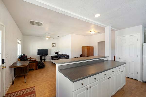 GUEST HOME/SHOP: ~1,440-sq. ft. approx. 60'x24' building with an ADU including complete kitchen, bar/counter area, front room, dining area, bedroom, bath and more. Building includes two large separate locked storage/shop rooms with exterior entrances and 220V power. A ~480-sq. ft. approx. 8'x60' covered concrete porch area along the full length of the north side of the building provides shade and weather protection.