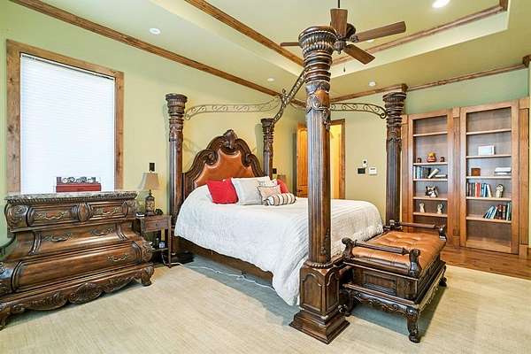 The 4,255 sq ft main residence showcases timeless design and elevated craftsmanship. Soaring wood-beamed ceilings, rich stone accents, and expansive windows create an atmosphere of warmth and quiet sophistication while framing picturesque views of the surrounding land. A dramatic stone fireplace anchors the living space, setting the tone for refined yet relaxed living. The chef’s kitchen is equally impressive, featuring premium Viking appliances, custom cabinetry, and an oversized island ideal for entertaining or everyday living.