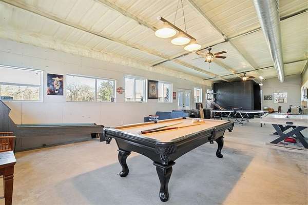 Equestrian and recreational features include a 3-stall horse barn with tack room, while a separate metal shop provides exceptional flexibility with a game room, workout space, and additional garage bays.