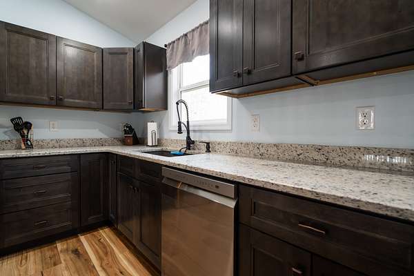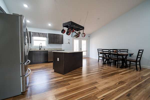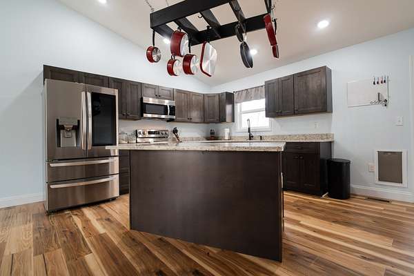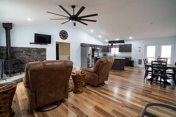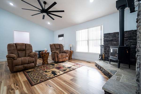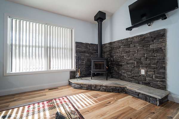 Step inside to an inviting open living room/dining room with a cozy wood-burning stove, stone hearth, and half stone accent wall. The kitchen is a chef's delight with self-closing Shaker cabinets, granite countertops, stainless steel appliances, and a smooth-top range. Durable LVP flooring flows seamlessly throughout the home.