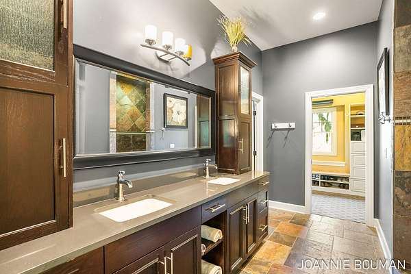 Welcome to your dream home in the prestigious gated community of River Trace. Nestled on a sprawling 3.3-acre lot, this beautifully crafted house offers 5 spacious bedrooms and 4.5 bathrooms, combining luxury, comfort, and functionality. The open concept showcases elegant hardwood floors throughout the main living areas, a large pantry, and a bar with a beverage refrigerator - perfect for entertaining. The heart of the home features a bright and inviting four-season room, ideal for year-round enjoyment. Retreat to the primary suite complete with a slate shower, walk-in closet, and a private deck overlooking the scenic landscape. The walk-out lower level has incredible additional living space, including three bedrooms, two full bathrooms, a large family room and a kitchenette. Call today! Perfect for guests or multi-generational living. Additional features include built-in lockers, professional landscaping, and a spacious patio, ideal for outdoor gatherings and relaxation. Don't miss the opportunity to own this exceptional property in one of the area's most desirable communities.