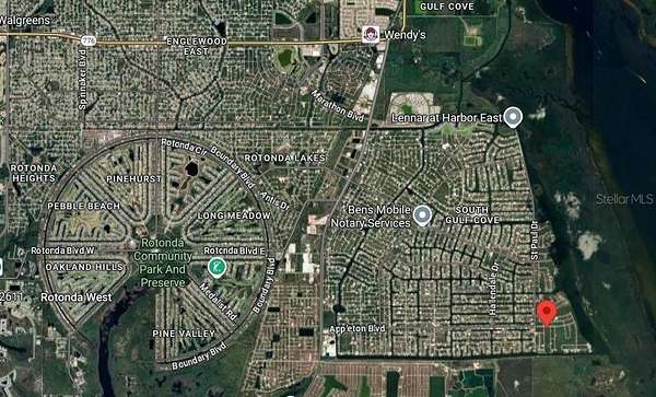 From Rt 776 / S. McCall Rd, drive south on Gasparilla Blvd. After a stop light on Marathon Rd you will start seeing entrances to South Gulf Cove on the left. Continue driving to the 4th entrance, Appleton Blvd. Turn left and proceed just over 3 miles to the other end of Appleton Blvd. Once you pass a stop sign on St Paul Dr, you will find the lots on the right just past Hillwood Dr.