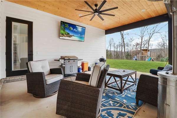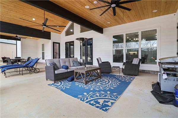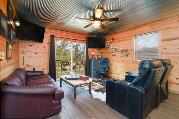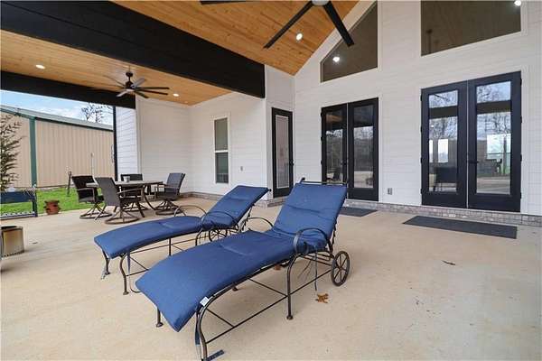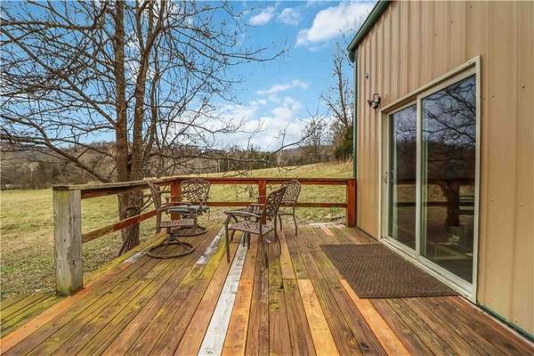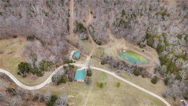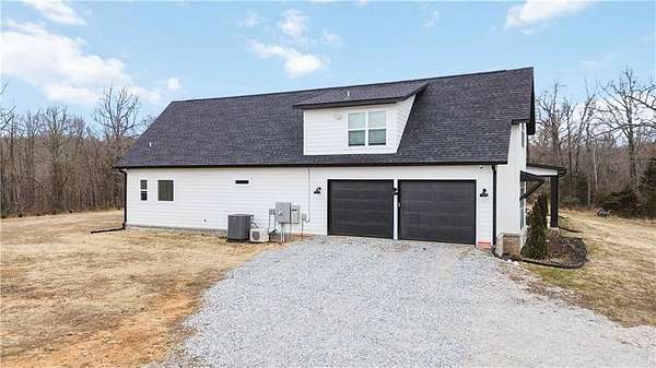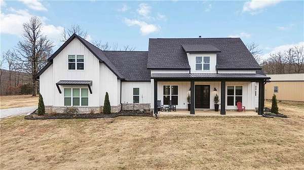 Ozark Mountain estate less than 25 minutes from the Fayetteville Square offering unmatched privacy and 360-degree views. Built in 2024, the 3,700 sq ft main home features 4 bedrooms plus a bonus room, 4.5 baths, and over 1,000 sq ft of covered wraparound porches. A separate 900 sq ft custom guest cabin includes 1 bedroom plus loft and 1.5 baths - ideal for guests or multi-generational living. Property also offers a 30x45 shop with full bath, private guest suite and rec space. There is an additional 30x30 project shop. Approximately 11 acres of open pasture for horses or hobby farming, along with 39 acres of wooded acreage, two clear creeks, a small pond, and private cave entrance. Automatic gated entry adds security to this rare end-of-road location combining luxury, privacy, and outdoor living - convenient to Fayetteville, U of A, dining, and shopping.