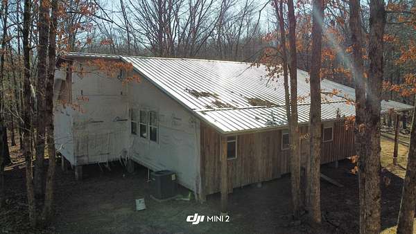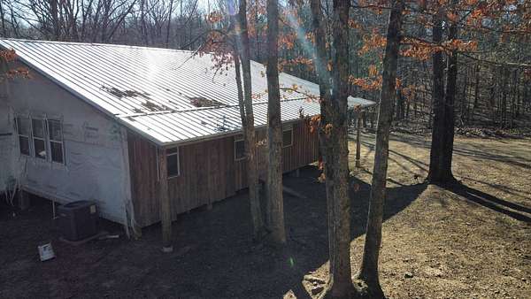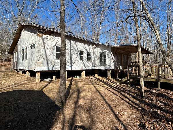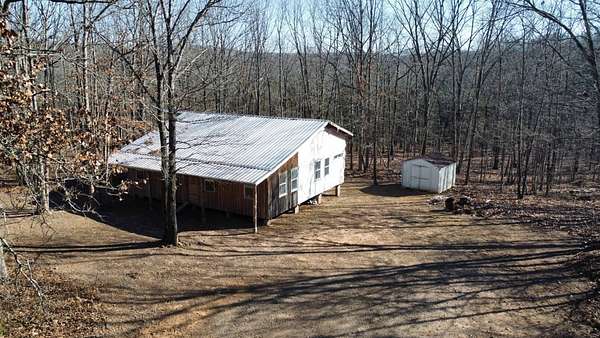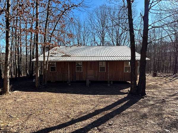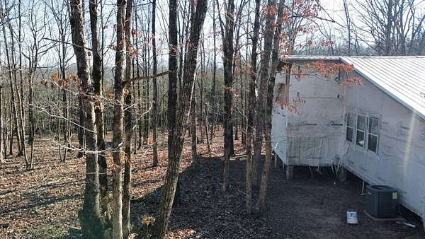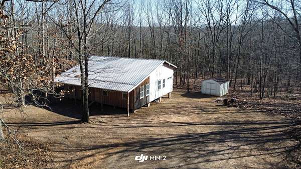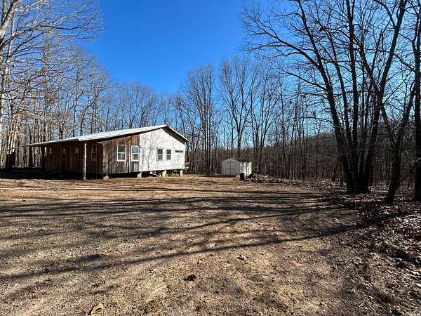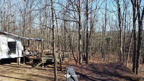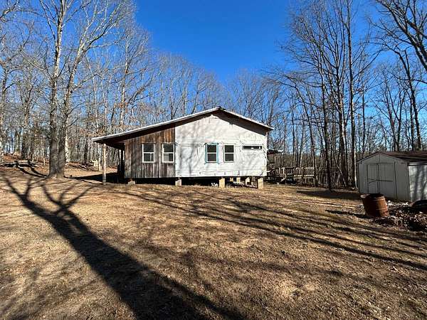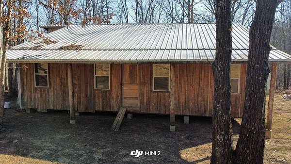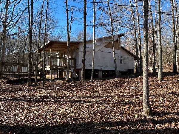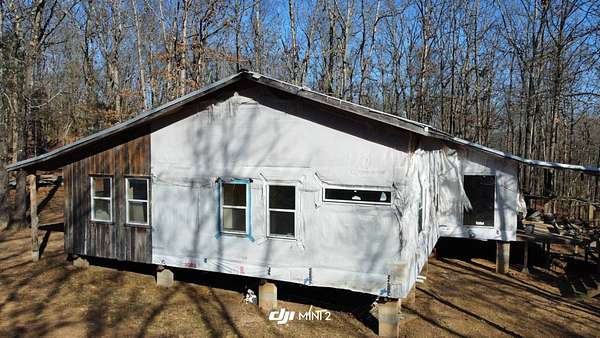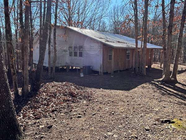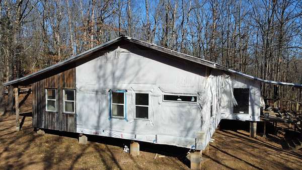 Here's an excellent opportunity to finish out a 1,424 sq. ft. home exactly to your taste. The home is approximately 70% complete and fully in the dry, offering unfinished oak hardwood floors with remaining flooring on site and still boxed, along with included cabinet doors and drawers to complete the interior. The home is all-electric, with the heat and air unit already on site. Water tap is in place with the line run to the exterior of the home, an electric pole is set at the property with the meter loop on site, and fiber internet is available. Located just 10 minutes from Ozark off Highway 219, with only a half-mile of county-maintained gravel road to the driveway, this property offers both the convenience of easy access and privacy. The land features a large, level, fenced and gated area at the top-ideal for parking trailers, ATVs, or weekend toys-and abundant wildlife including deer, turkey, and bear. Enjoy the outdoors from the spacious two-level back deck, partially covered and perfect for morning coffee or evening relaxation. The 2-bedroom, 2-bath layout includes a large living room highlighted by two sets of double doors opening to the deck. Situated on approximately 5 acres (+/-), this property provides a generous buffer and a rare chance to customize a home in a peaceful setting.