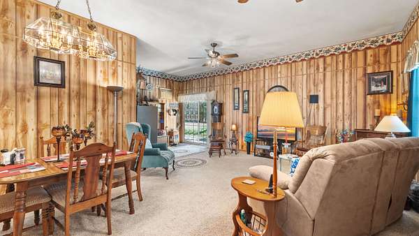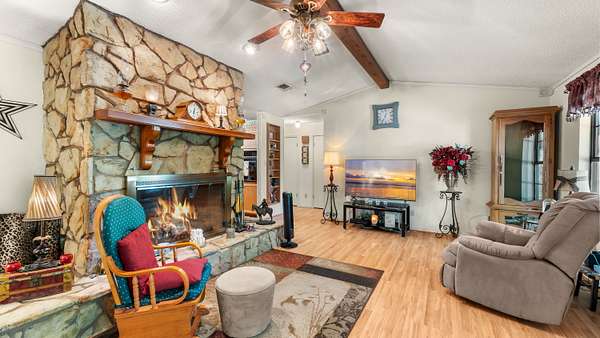 Wood‑burning rock fireplace in living room