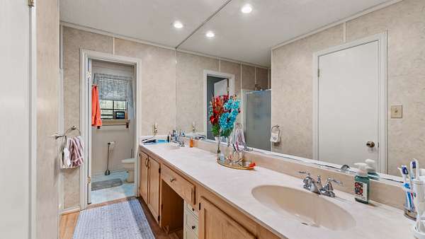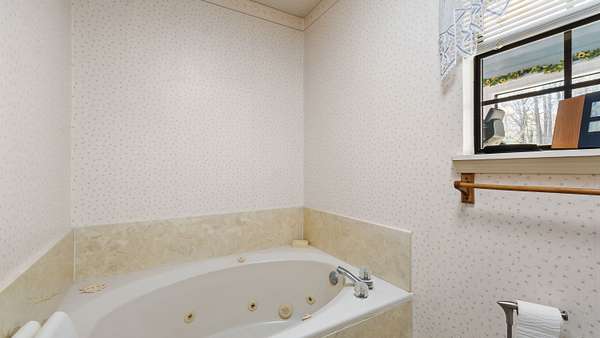 Master suite: double vanity, whirlpool tub, stand‑up shower, walk‑in closet