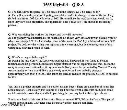 Calling all contractors, visionaries, and HGTV binge-watchers who think 'I could do that'! Welcome to 1565 Idylwild, where the dream is framed, thedrywall is up, and the rest is a glorious choose-your-own-adventure. This isn't just a house, it's a DIY starter pack. Inside, you'll find almost everything youneed to finish it: drywall sheets, buckets of mud, wiring that's politely waiting for someone to tell it where to go, and a vanity that's ready for its sink soulmate.Think of it as the Costco sample platter of homebuilding, just enough to get you hooked, but you've gotta bring your own appetite. Oh, and yes.. appliancesare included, along with the long-term mouse tenants who've been paying rent in crumbs for years. Other surprises await, but hey, that's half the fun, right?Outside, you've got a rustic cabin vibe that screams potential... plus a shed that honestly needs to be torn down but could be rehabbed. The lot is pepperedwith natural boulders, trees, and charm... Mother Nature clearly started the landscaping project but left it unfinished, too. This is not for the faint of heart. Butfor the right investor, flipper, or builder with vision? It's the ultimate project. Bring your toolbox, roll up your sleeves, and make this little Prescott hideaway yourmasterpiece!