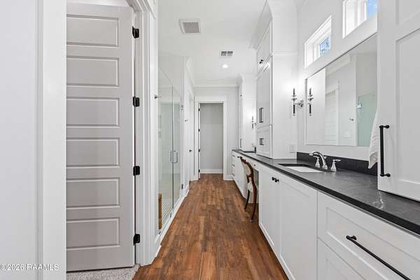 - 9+ ft Ceiling, Attic Access, Crown Molding, Double Vanity, Electric Dryer Con, Electric Washer Con, Gas Stove Con, Granite Counters, High Ceilings, Kitchen Island, Primary Bath, Walk-In Closet(s)