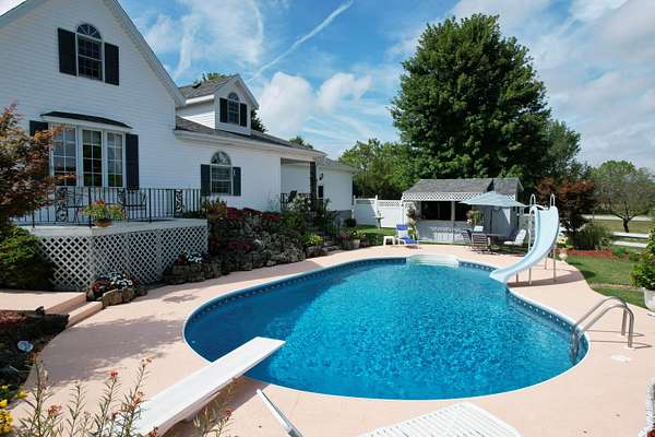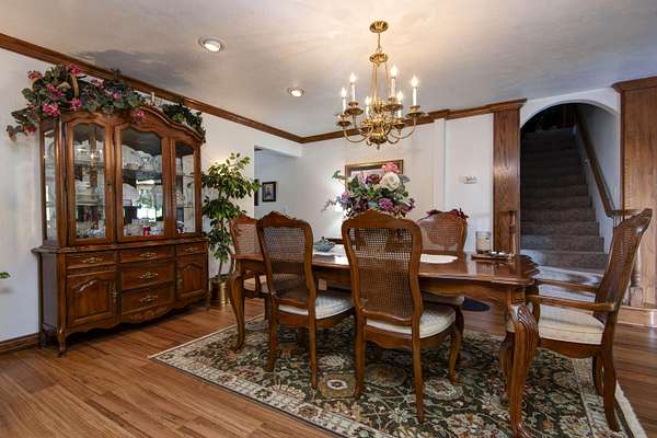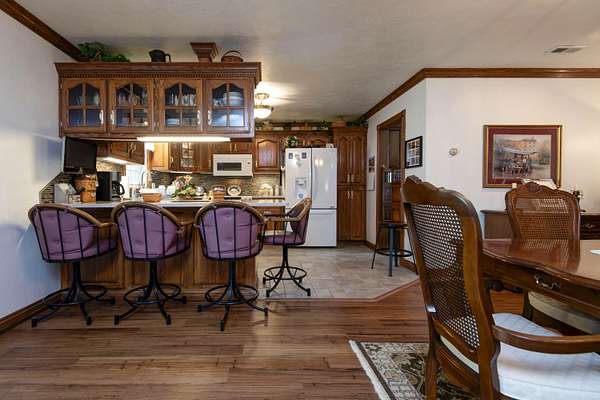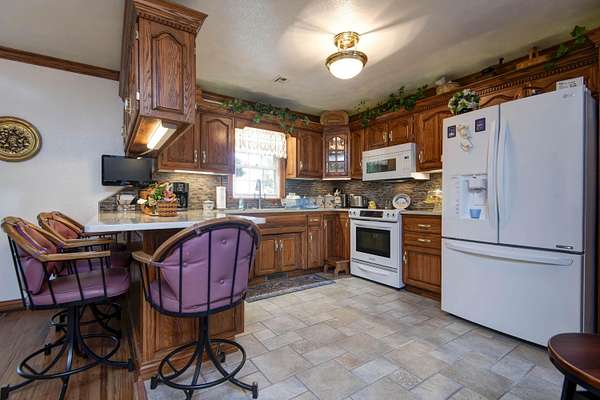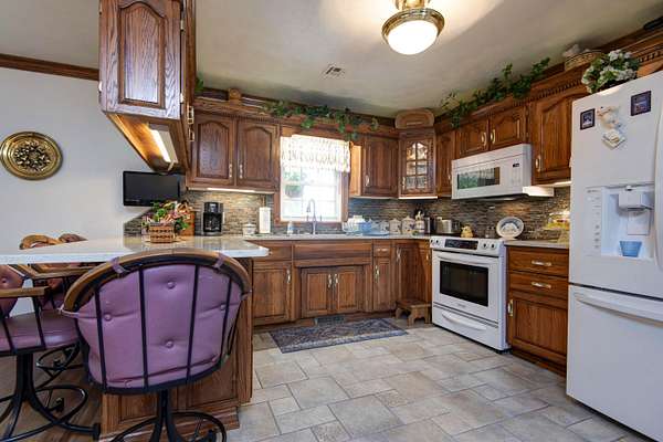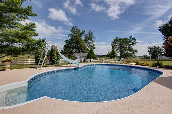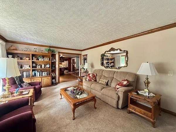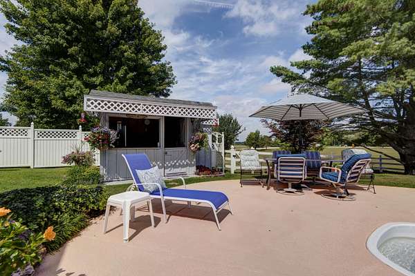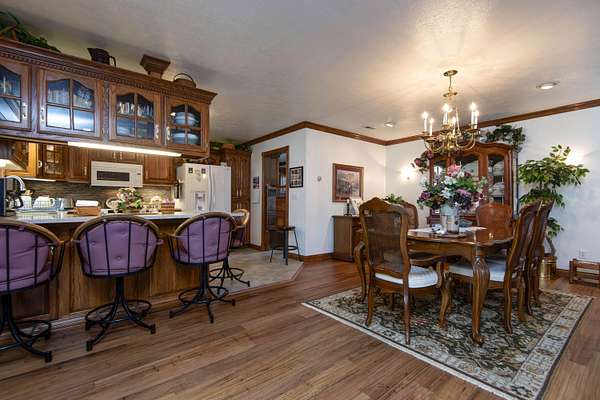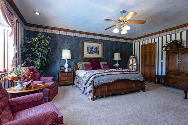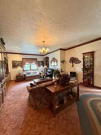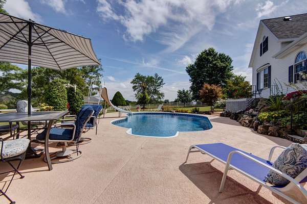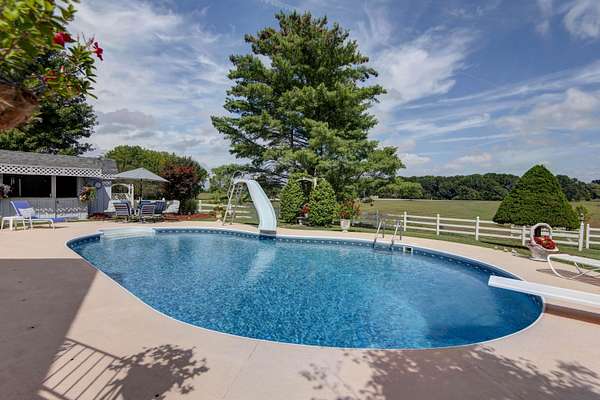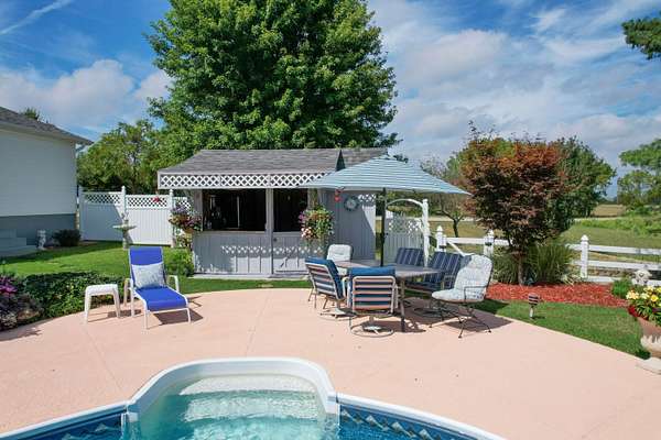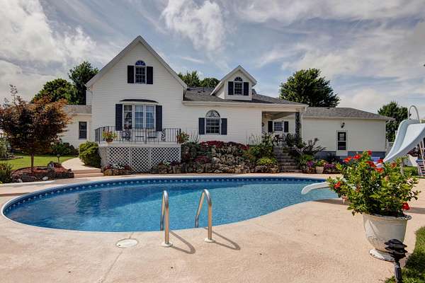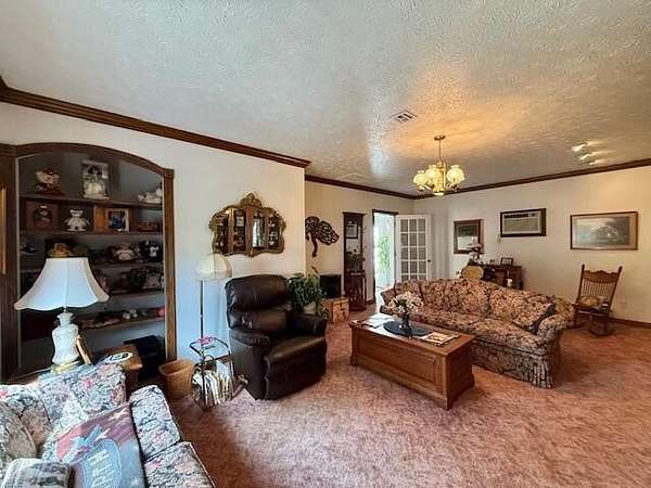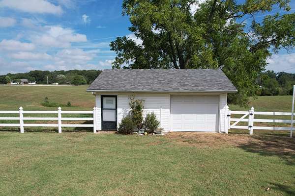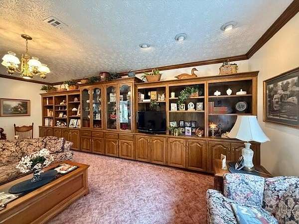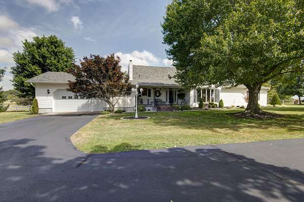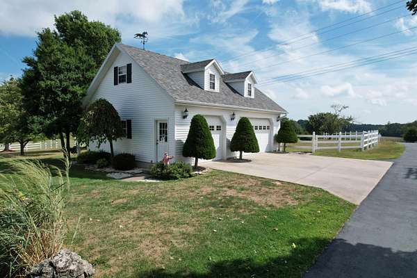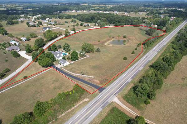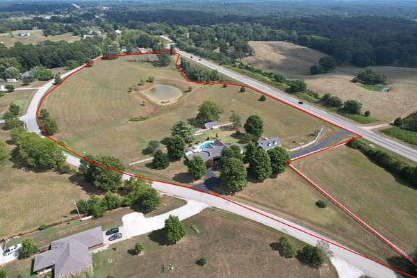 Remarkable home located on 12.04+/- acres with two entrances, one with direct access and Highway 160 frontage! This meticulously well maintained home features a split three bedroom floorplan with two living areas and three baths. From the front porch, you're greeted with one of the two living areas adjacent to spacious kitchen with separate dining area complete with custom glass front cabinets, quartz countertops, tile flooring & breakfast bar leading to the laundry area and back porch overlooking the custom waterfall fountain, the heated in-ground pool with diving board and slide, pool house with its own half bath & bar, perfect for summertime entertaining!! Back inside the main level of the home is the 2 car oversized attached garage with pellet stove, painted floors, work area, plentiful storage and access to the partial basement & storm shelter. Moving back inside to the living area of the home, you will find the second pellet insert fireplace, built-in cabinetry accented with crown molding, floor to ceiling windows leading into the enclosed sunroom adjacent to the second living area with plentiful cabinetry and open closet which could be used as a bedroom or office. The separate Master bedroom suite is complete with a large walk-in bath, with oversized walk-in shower, dual vanities & jetted tub. Moving upstairs, the home is finished out with the remaining two bedrooms, a full bath and office area. The acreage also features a large pond, tool shed with garage door & electric along with a detached garage building featuring a loft area which could be converted into additional living space. Property could be split into additional building sites with city water line located along Glossip or a Commercial build with Highway 160 frontage, the possibilities are endless!! Don't miss this one!!