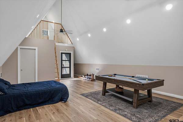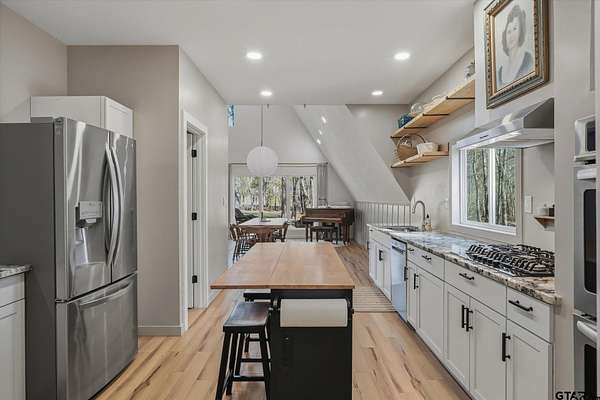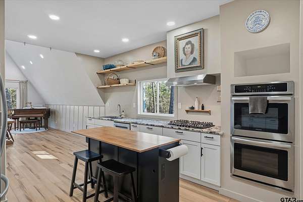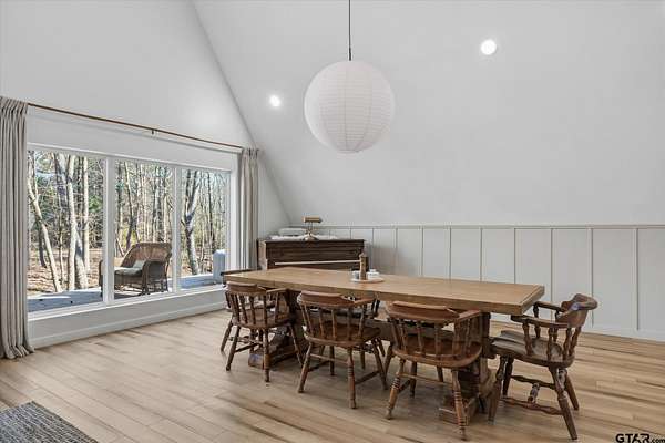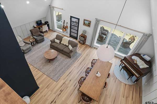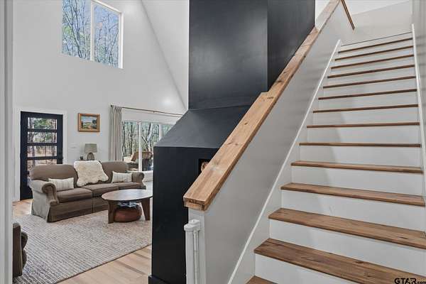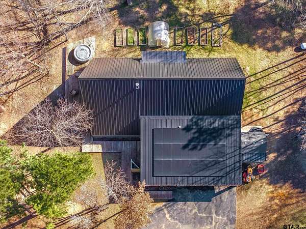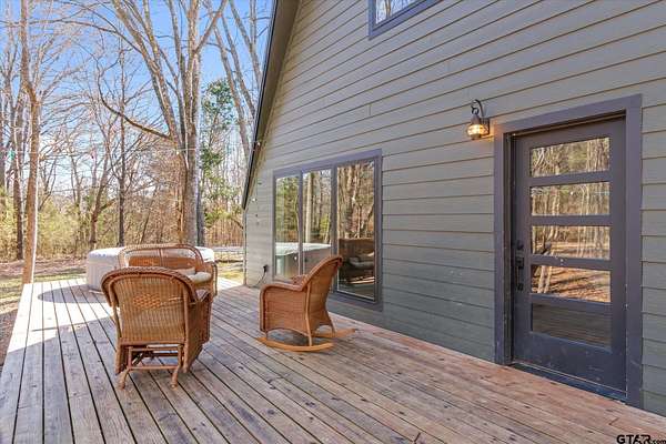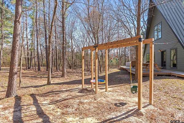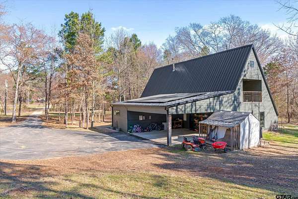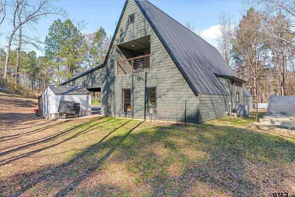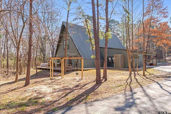 Welcome to Creek Crossing - one-of-a-kind modern A-frame retreat set on over 3 acres of serene, East Texas land. Thoughtfully designed, this property blends the warmth of rustic cabin living with the clean lines and elevated finishes of contemporary farmhouse style. Walk in and be wowed by the soaring vaulted ceilings, striking floor to ceiling black matte fp column with wood-burning stove and light hardwood flooring throughout. Brimming with character, the home boasts warm minimalism, natural materials, open shelving, an abundance of natural light and fun features like an indoor swing and large loft game room/bonus room with balcony. Outside, enjoy watching wildlife from the expansive front deck. A gated entrance adds privacy and security, while the two-car carport provides convenient covered parking. For those dreaming of a mini-farm, the property includes a corral, gardening beds and chicken coop already in place. Solar panels offer low utility bills and a partial home generator provides security in storms. Location is key, and this home delivers. Just minutes from I-20, you'll have quick access to Lindale and Tyler's shopping, dining, and medical facilities, with an easy commute to the Metroplex. Enjoy highly regarded Lindale schools while coming home to peace and space. Seller offering buyer's closing costs up to $10k depending on offer.
