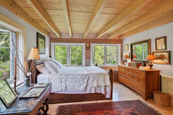 You will find this outstanding property at the end of a quiet country lane in West Tisbury nestled alongside hundreds of acres of conservation land and walking trails that extend all the way to Lamberts Cove Road. The setting is magical - 4 acres of rolling lawns with specimen trees and ponds. There are multiple structures to allow you to customize this compound to your personal needs. The main house was recently renovated by a top local contractor and the result is a rustic Vineyard vibe with a sophisticated twist. The cozy and comfortable kitchen and sitting room areas lead to the dramatic Great Room on the north end of the house - the 600 square foot space with its 26'-high ceilings is bathed in light thanks to the banks of windows and French doors. There are two bedroom suites upstairs with views of the main pond, one of them with a sundeck. The third floor loft area has also been used as a bedroom and is the perfect spot to accommodate younger members of the family and their friends. The detached two-story guest quarters continue the Vineyard country chic theme with a delightful bedroom with veranda overlooking a separate area of the property from the main house.