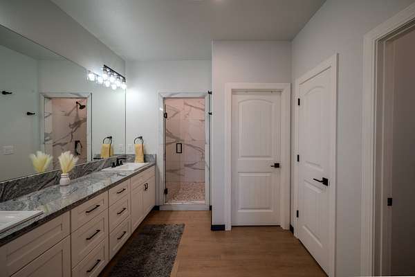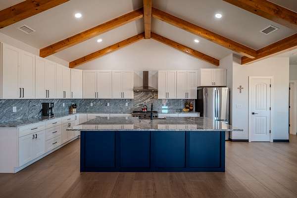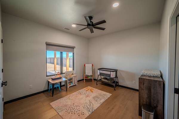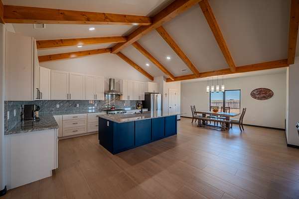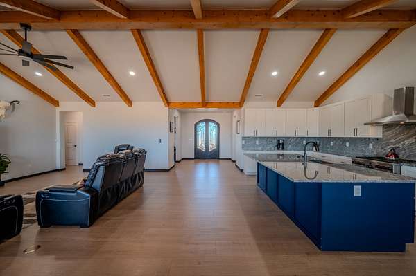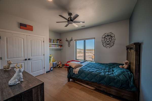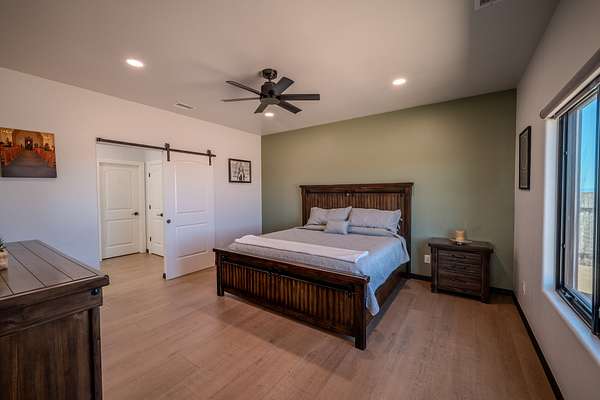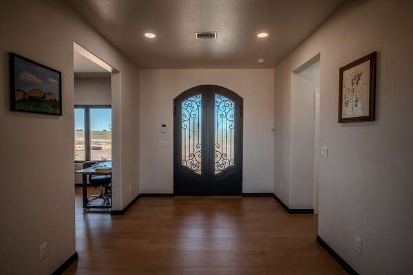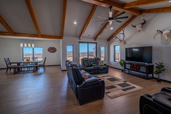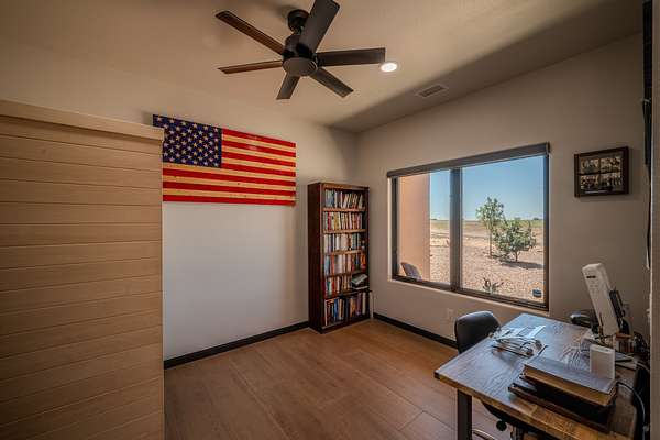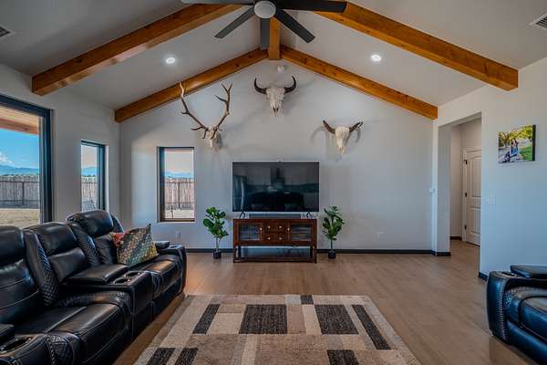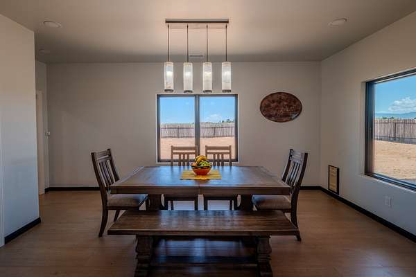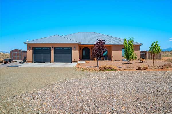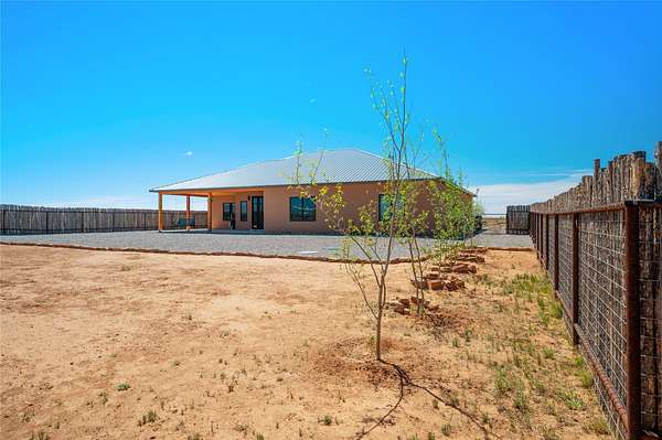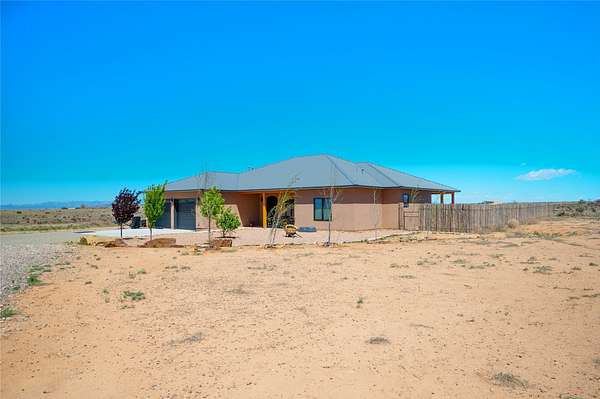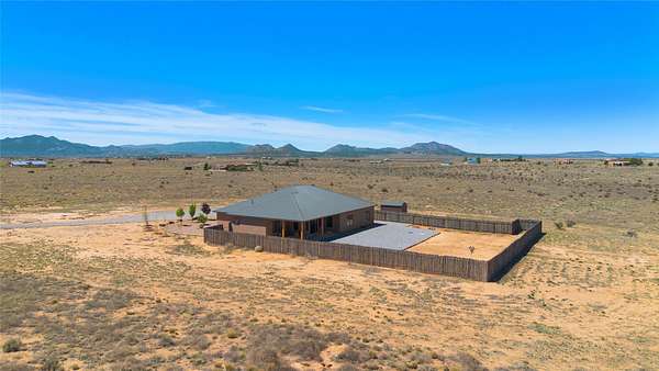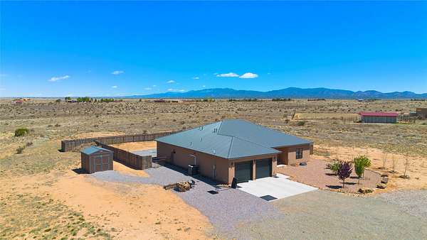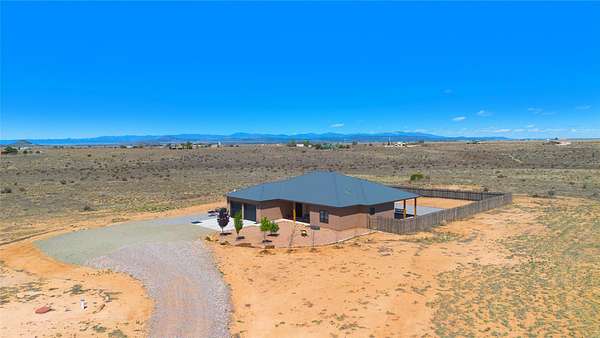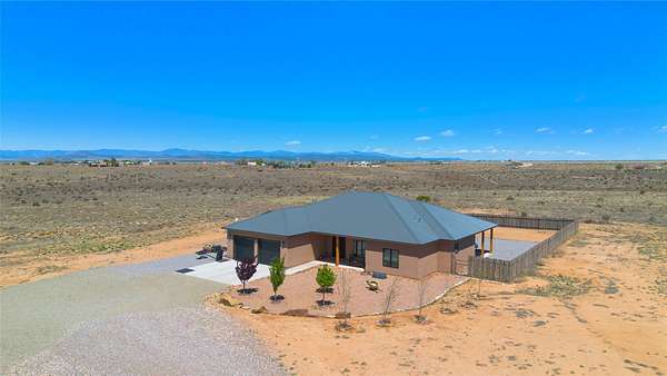 Mountain views from every window and an abundance of natural light fill this beautiful 2-year-old home. The style is contemporary pueblo with a pitched metal roof and open floor plan situated on 16 acres. The 4th bedroom is best suited for an office near the front entrance. The floor plan provides separation of bedrooms and a large master bedroom with a comfortable bathroom, big shower and a walk-in closet. Other features include a cooks kitchen with lots of storage, tile floors, high vaulted and beamed ceiling, central a/c and heat, and a spacious yard with latia fencing and recent landscaping with many young trees. The open floor plan is perfect for large gatherings or quiet enjoyment. The neighborhood is a well-managed and maintained gated community. Add equestrian facilities to this property and live the dream. Just 10 minutes from shopping, dining, airport and entertainment, this idyllic rural community is a great commuter location weather going to downtown Santa Fe, Albuquerque or Los Alamos.