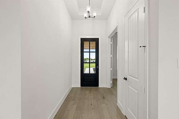 An inviting foyer opens to the expansive great room, where a fireplace creates a warm, welcoming focal point. The open-concept layout flows seamlessly into the gourmet kitchen—the heart of the home—featuring waterfall quartz countertops, built-in Samsung appliances, soft-close cabinetry, and a large walk-in pantry.