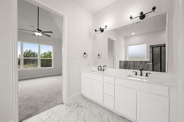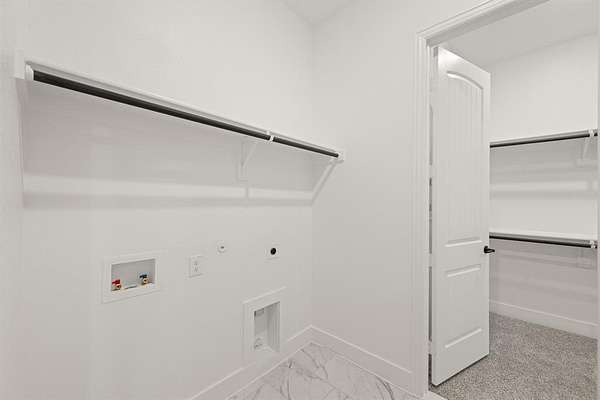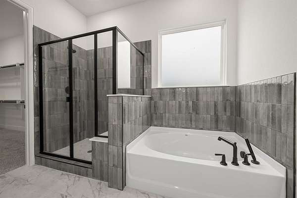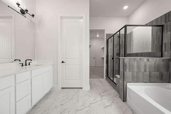 The primary suite is a true sanctuary, highlighted by an oversized walk-in shower, separate soaking tub, and an exceptionally large walk-in closet with direct access to the laundry room for added convenience.