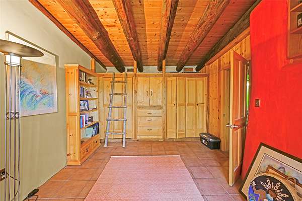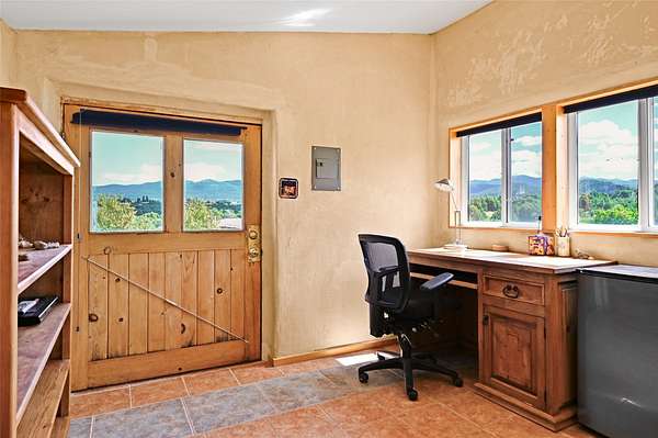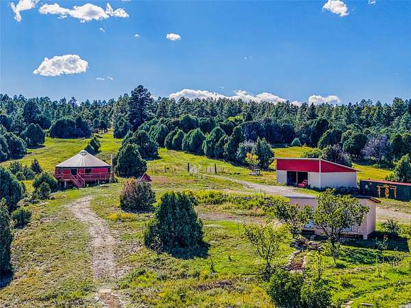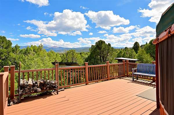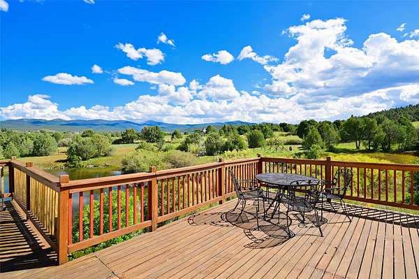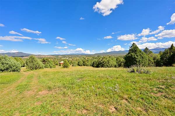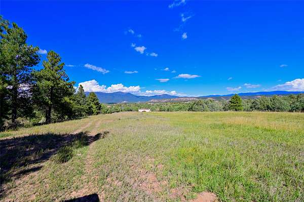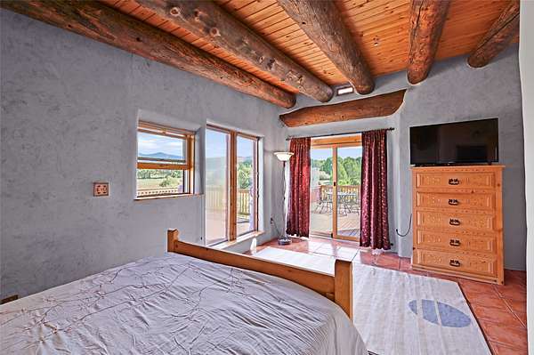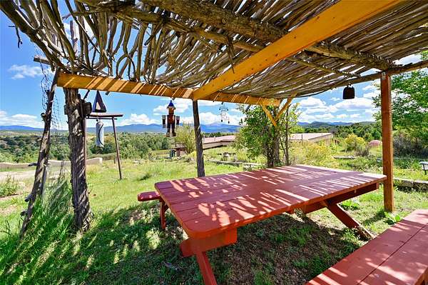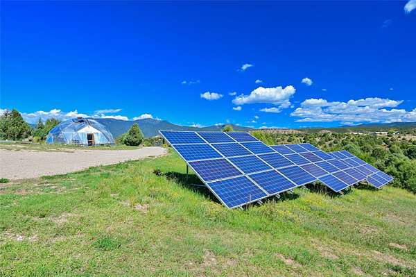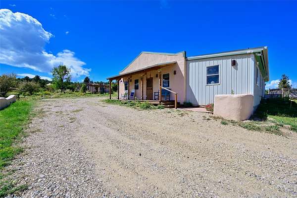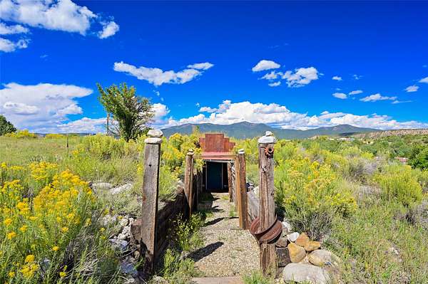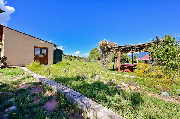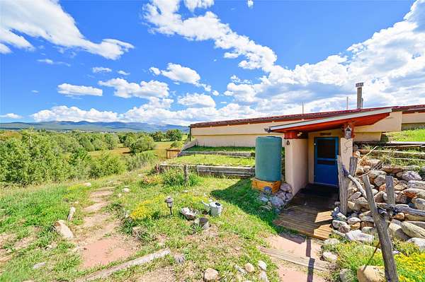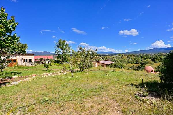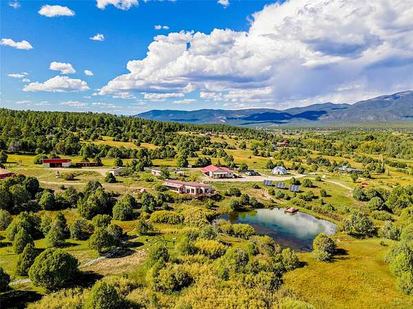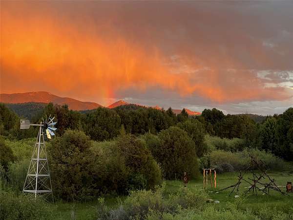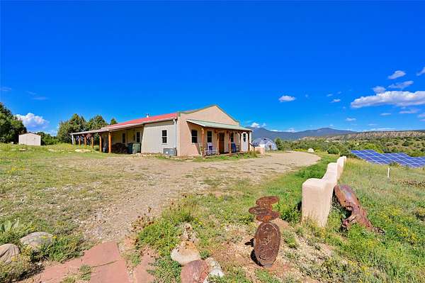 A truly rare 34-acre mountain retreat awaits, nestled in the Sangre de Cristo Mountains with stunning views of Jicarita Peak and Truchas Peaks. This exceptional, self-sufficient, and sustainably developed property is perfect for a small family business, equestrian estate, or serene retreat center. The total living space of 4,100 sq ft includes a charming 1,600 sq ft earth-bermed 2-bedroom home featuring custom stone floors, vigas, radiant in-floor heat in the kitchen and master suite, and an updated kitchen with a Wolf Stove and granite countertops. The home is designed for energy efficiency, maximizing solar gain, and has a wrap-around deck with captivating pond and mountain views. The property also boasts a 2,225 sq ft office/mixed-use building (zoned for cottage industry, previously a successful institute), a 275 sq ft studio/guest house with a half-bath, and a 30' insulated yurt with off-grid solar, ideal for meditation or a classroom-offering immense flexibility and separate spaces for living, working, and gathering. Outside, find unparalleled amenities dedicated to Earth Stewardship and conservation: - 10 irrigated acres with water rights for farming or grazing. - Rustic 3-stall horse barn and tack room, horse fencing throughout property. - 33' geodesic Growing Dome for year-round production. - A comprehensive water catchment system utilizing heavy-duty roof guttering on all buildings and multiple cisterns. - A quarter-acre pond with a Trex deck, fed by wetlands and springs, and aerated by a windmill. - A vast network of maintained trails on forested acres (thinned and managed), offering direct access to the Carson National Forest. Additional features include an owned grid-tied solar array, a root cellar, a 40' cargo container, and extensive landscaping with drip irrigation. This property is a rare gem, beautifully developed, and ready for its next steward.