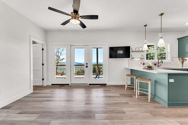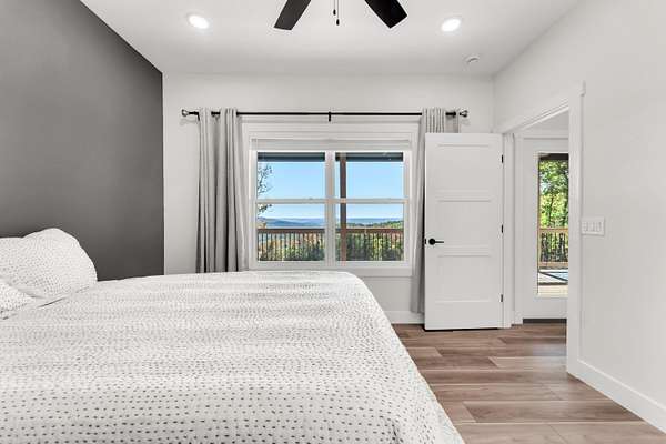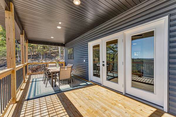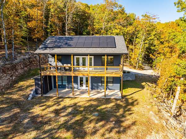 Discover peaceful Ozark living on 13.1 scenic acres near Table Rock Lake, offering privacy, flexibility, and room to breathe. This rare acreage property provides one-level living surrounded by wooded views, with space for outdoor recreation, gardening, or future expansion.The all-electric home features owned solar panels with battery backup, a private well, and septic system--resulting in very low utility costs. Inside, the kitchen offers fingerprint-resistant black appliances, while the main-level bath includes heated tile floors with conveniently located laundry nearby.Step onto the expansive deck or walk out to the large, hot tub-ready patio to enjoy the forested landscape and distant lake view. A storage shed on the patio adds extra functionality.Located in the Table Rock Lake area just north of Kimberling City, this property blends comfort, efficiency, and the tranquility of the Ozarks with the freedom that only acreage can offer. Agent is the owner.