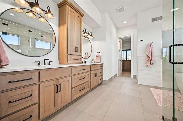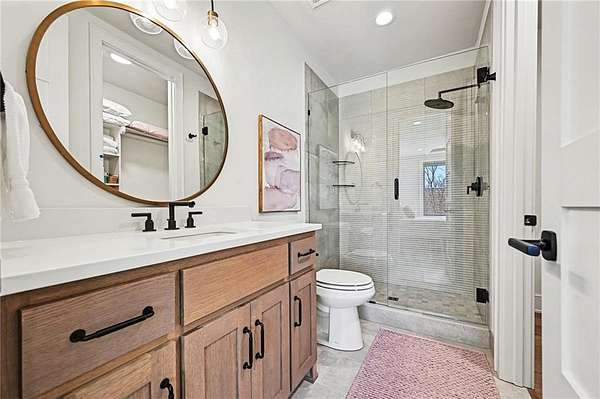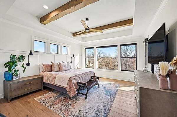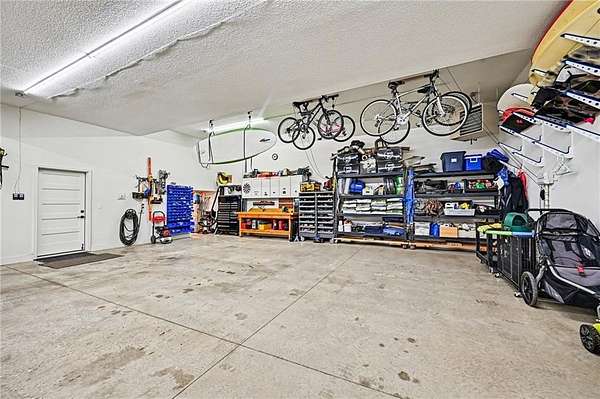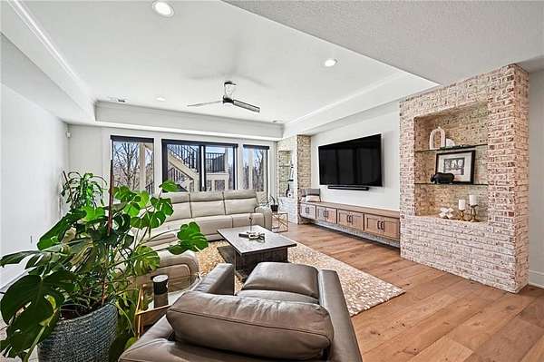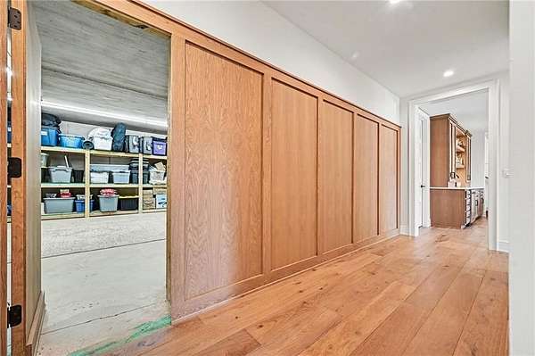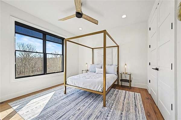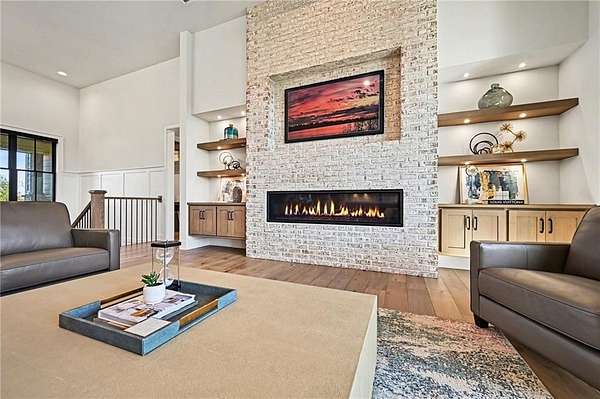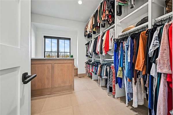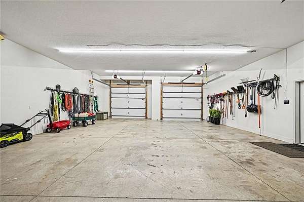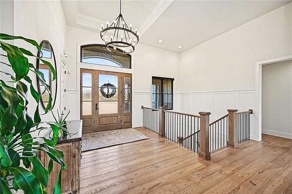 You don't just buy a house like this-you step into a lifestyle. Set on 5.75+/- acres, this builder's own custom reverse 1.5-story estate offers private walking trails leading straight to the lake. A gated entry, winding drive & lush landscape set the stage before you reach the front door, where a grand foyer welcomes you in cinematic fashion. The living room is a showstopper w/a dramatic brick fireplace featuring adjustable heat & color, custom-lit shelving, floating cabinetry, beamed ceilings & electric shades for effortless ambiance. The kitchen is a dream w/JennAir appliances, hidden refrigerator, expansive walk-in pantry w/prep station & beverage fridge & a waterfall island made for casual dining or magazine-worthy gatherings. Vaulted ceilings & scenic views elevate the dining space. Thoughtful design continues w/a drop zone off the garage, home office w/built-ins, guest bedroom & full bath. The owner's suite occupies its own wing w/beamed ceilings, deck access & sweeping views. The ensuite impresses w/a glass-enclosed zero-entry shower w/dual heads, soaking tub & a dream walk-in closet w/island dresser, shelving, mirrors & pull-down rods. Nearby laundry keeps life running smoothly. The finished lower level is made for entertaining & living large. A secondary living space features decorative brick shelving & a wet bar, plus a gym w/built-in sauna. 2 additional bedrooms each have private baths & generous walk-in closets. A hidden suspended garage entry adds a delightful surprise & a half bath plus unfinished storage w/second laundry complete the level. The detached carriage house is a property of its own w/an oversized garage fits a boat or RV w/220-amp power. Upstairs, a finished living space mirrors the main home's quality w/fireplace, scenic lake views, full kitchen w/JennAir appliances, walk-in pantry, laundry & a spacious bedroom w/walk-in closet. This estate delivers privacy, craftsmanship, and lakefront living-all in one extraordinary package.