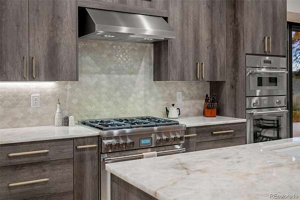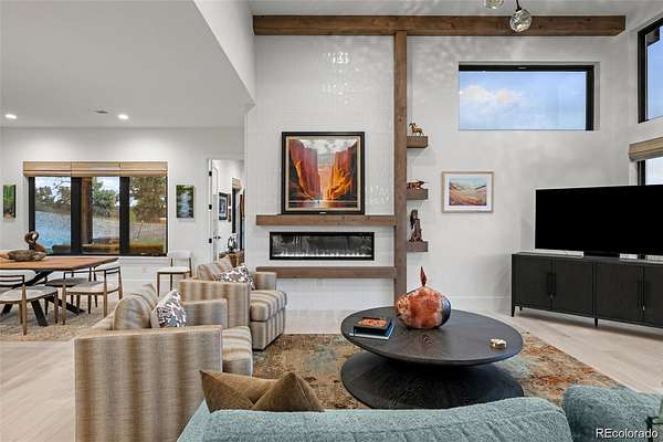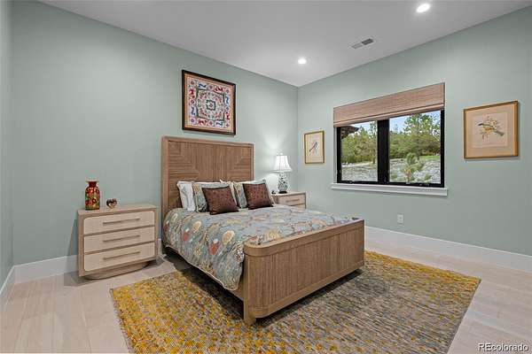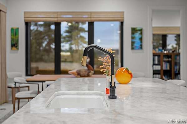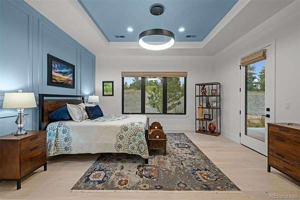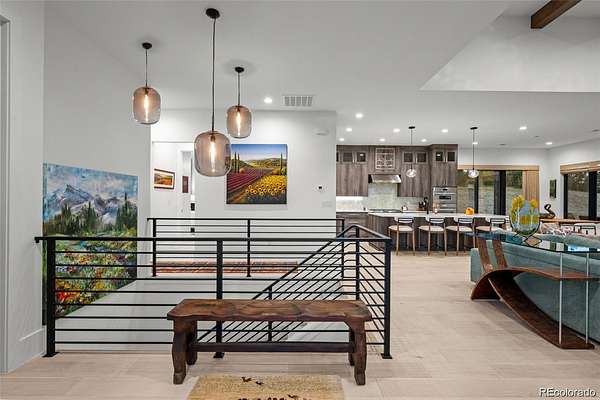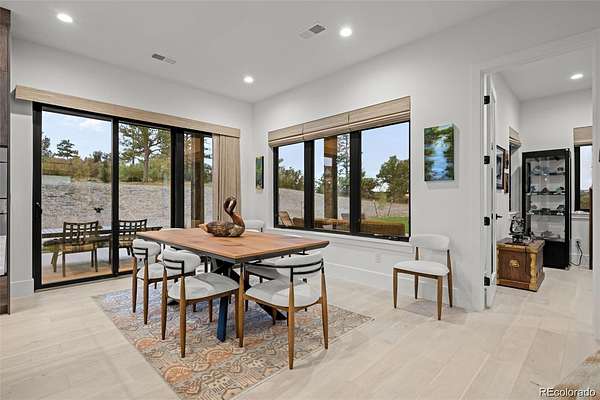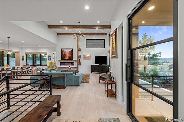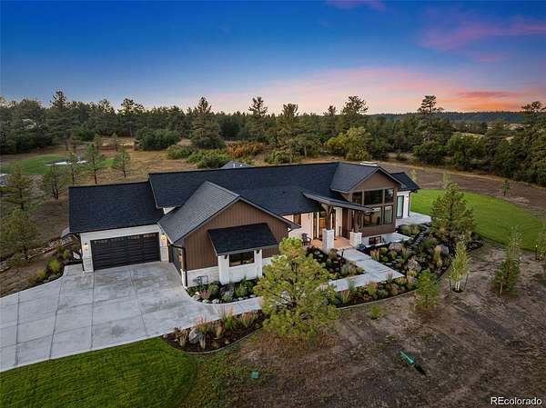 Set on two private acres in Franktown, this custom ranch estate blends Colorado luxury with everyday comfort. Framed by towering pines and Front Range views, it offers refined single-level living just minutes from Parker. Inside, soaring 10’ ceilings and walls of windows highlight wide-plank hardwood floors, architectural beams, and stunning Cristallo quartz surfaces. The gourmet kitchen features cabinetry with glass accents, a full Thermador suite, and a walk-in pantry with butcher block workspace. The primary retreat is a sanctuary with heated floors, a freestanding sculptural tub, spa shower, dual vanities, and a custom closet. A fully finished garden-level basement expands the home with a sophisticated wet bar, rec room, and two oversized bedrooms with private Jack and Jill bath, plus a dedicated entertainment area. Professionally designed landscaping with lush sod, extensive perennial plantings, decorative boulders, and custom hardscape creates a park-like setting. Motorized woven shades, select window tinting, designer fixtures in matte black and gold, and custom garage cabinetry elevate every detail. The 4 car garage is equipped to add electric charging and features custom, built in storage from Closets by Design. This buyer will also receive water rights to the Upper Dawson aquifer. Experience front range sunsets in Arrowpoint Estates. The gated community provides security, private walking trails, and snow removal, all just 7 minutes from Castle Rock and Parker. Owners spent over $190K on additional upgrades and landscaping. Home has Anderson windows and sliding doors throughout. For more photos and information, visit 1571arrowpoint.com