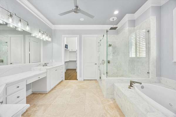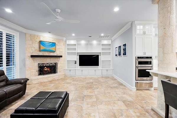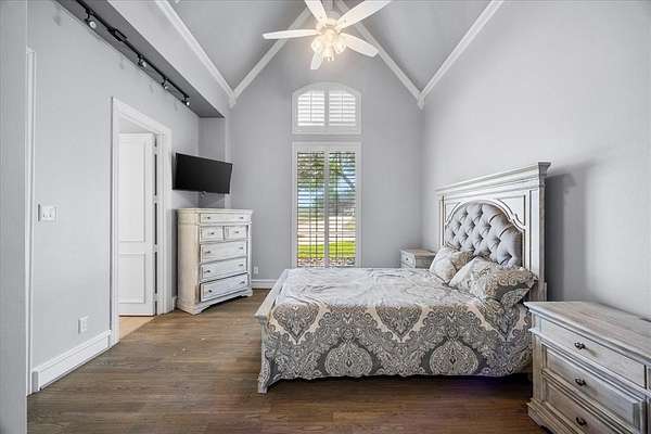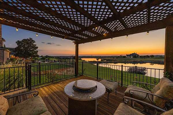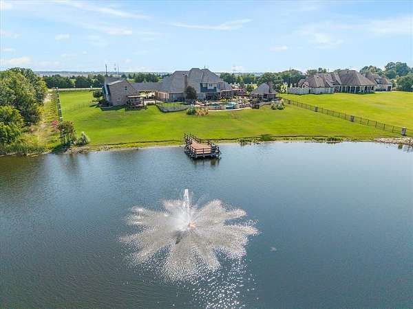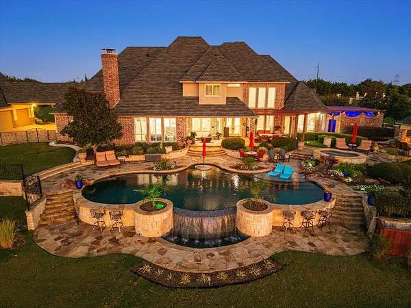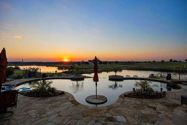 Magnificent neo-traditional estate gracefully set on nearly three acres, perfectly positioned to capture sweeping views of private lakes, rolling countryside, and breathtaking sunsets. Offering over 6,500 square feet of luxurious living, this home combines timeless design with thoughtful updates including a new roof, foam insulation, tankless hot water heater, interior paint, wood flooring and kitchen and primary bath. Inside, six spacious bedrooms--three downstairs and three up (all but one are ensuites) all complemented by 4 sep living areas, a media room, and a serene primary retreat with its own private courtyard. Car enthusiasts will appreciate seven garages, three climate-controlled, providing versatile space for collections or hobbies. The outdoor living is equally extraordinary, featuring a pavilion-style kitchen with pizza oven, gas grill, griddle, refrigerator, and ice maker--designed for entertaining in style. Overlooking it all, a dramatic infinity-edge pool, oversized spa, and cascading waterfall set the stage for resort-style relaxation. This estate is more than a home--it's a lifestyle defined by luxury, privacy, and distinction.