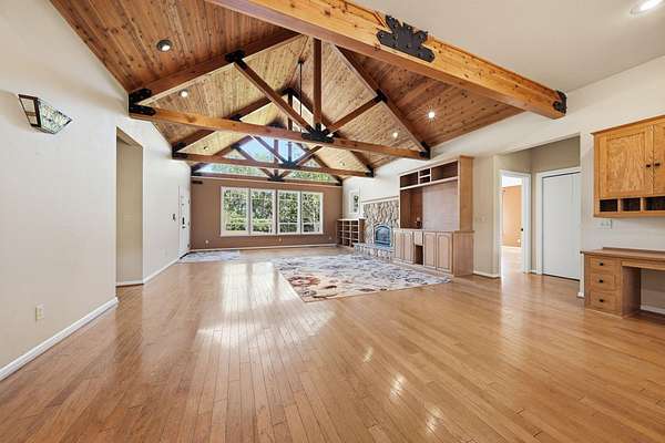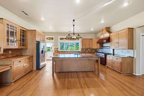 Tucked away at the end of a quiet cul-de-sac just minutes from Grant School, this custom Craftsman-style retreat offers a rare blend of privacy and luxury on over 5 acres. The property is a natural oasis, featuring a seasonal creek and tranquil pond, and picturesque meadow views. Inside, the home shines with stunning beamed ceilings and rich hardwood floors. The chef's kitchen is a true centerpiece, designed for both high-end cooking and effortless entertaining. The versatile layout includes three main-floor bedrooms, plus a spacious downstairs area--perfect as a rec room, pool house, or private guest suite with its own full bath. Outdoor living is equally impressive, with a covered back deck overlooking the pool and lush lawns. High-value extras include: Modern Tech: A pre-installed Tesla charger and leased solar for lower energy costs. Security & Storage: A built-in safe and two separate access points for expansive under-house storage. Curb Appeal: A grand circular driveway and an enclosed play yard. This unique estate is ready for a new owner to enjoy its perfect balance of character and convenience.