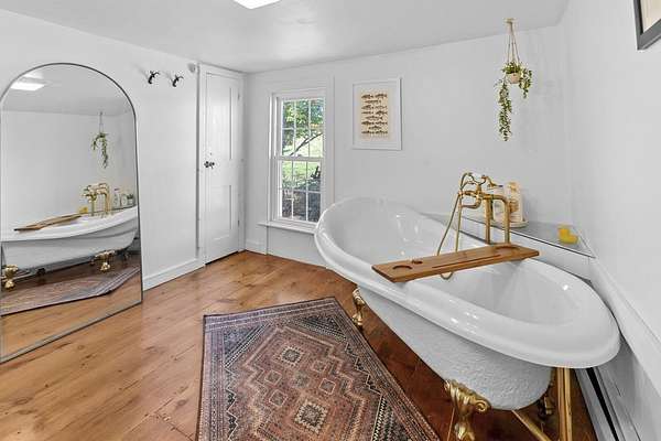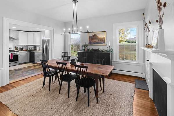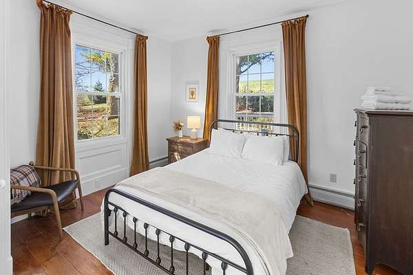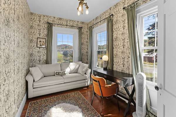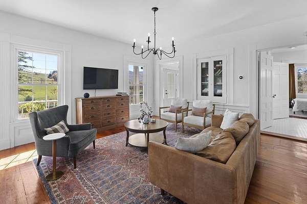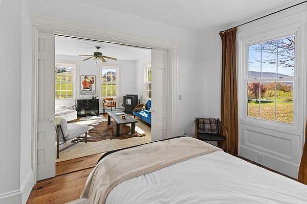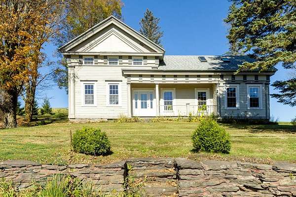 Elegant Greek Revival Farmhouse set on almost 3 acres amid rolling Catskills countryside and bordered by hundreds of acres of agricultural easement land. This stunning Greek Revival farmhouse offers a beautifully renovated interior with preserved period details and sweeping valley views. Inside, classic craftsmanship meets modern comfort. The home features four bedrooms and two and a half baths, with high ceilings, hardwood floors throughout, original pocket doors, and original woodwork that highlights its rich heritage. In the oldest part of the home, American Chestnut wide-plank floors reflect the artistry of the early Catskills. A round staircase anchors the entry, leading to bright and inviting living spaces, including two living rooms, a formal dining room, and a study ideal for remote work or creative pursuits. The large dine-in kitchen provides ample space for cooking and gathering, while a mudroom entrance adds everyday convenience. Step outside to the expansive back deck, where you can take in views of the valley and enjoy the peace of being surrounded by protected farmland-ensuring your views and sense of space will remain untouched for generations to come. With its elegant blend of historic charm and thoughtful updates, this Catskills farmhouse offers refined country living in a truly idyllic setting close to Stamford and Hobart Book Village.