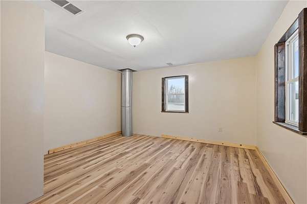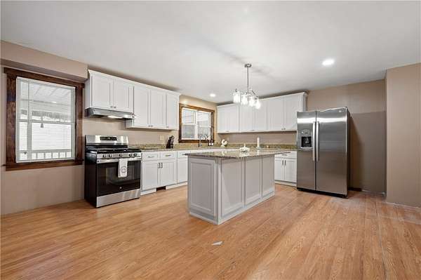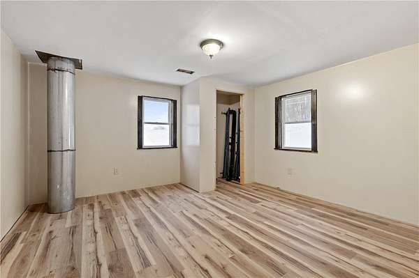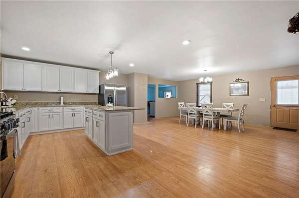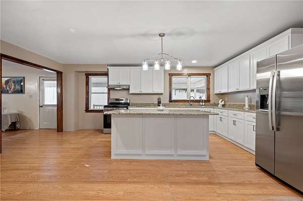 This five-bedroom, two-bathroom home offers approximately 3,010 square feet of living space situated on a private lot of approximately 2.81 acres. The open-concept layout creates a spacious and inviting atmosphere. The recently updated kitchen features brand-new Amish-built cabinetry and granite countertops, providing ample storage and preparation space. The primary bedroom, located on the first floor, includes an en-suite bathroom for added privacy and convenience.