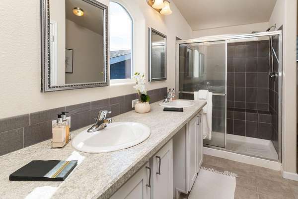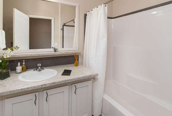 - Breakfast Bar, Double Vanity, Kitchen Island, Laminate Counters, Linen Closet, Open Floorplan, Primary Downstairs, Shower/Tub Combo, Walk-In Closet(s)