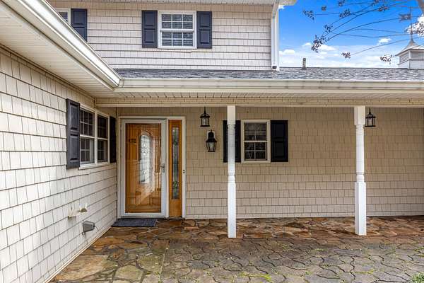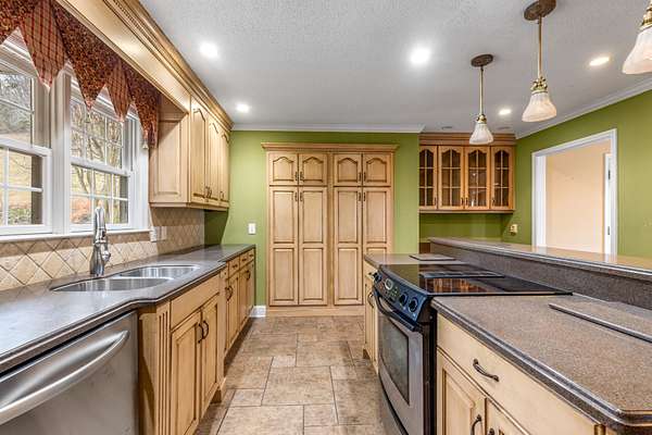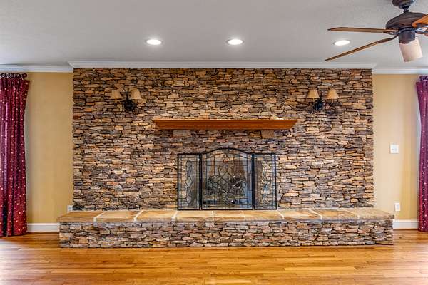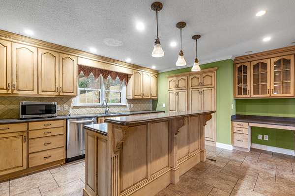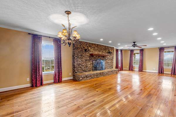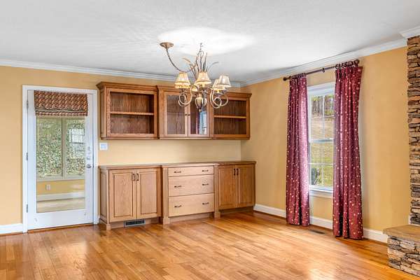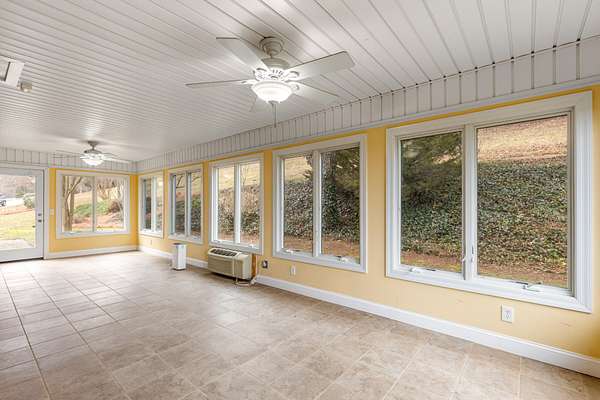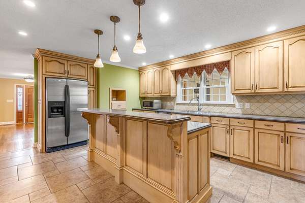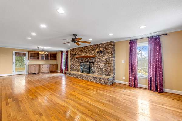 Inside, the living room is centered around a grand stone fireplace, creating a warm and inviting focal point for gatherings or quiet nights at home. The spacious kitchen offers ample cabinetry and built-in shelving, combining functionality with character while providing plenty of room for cooking and entertaining. Just beyond, a large insulated sunroom floods the home with natural light and offers year-round enjoyment of the picturesque landscape.