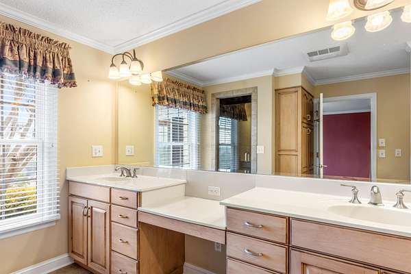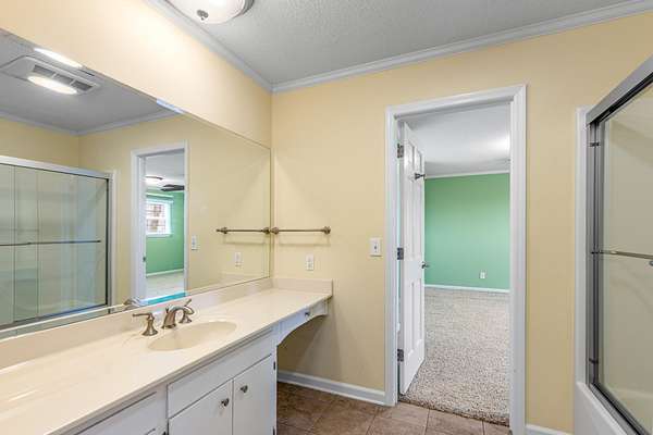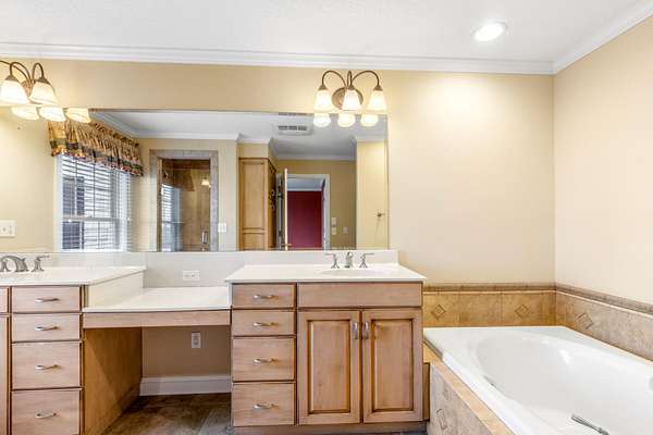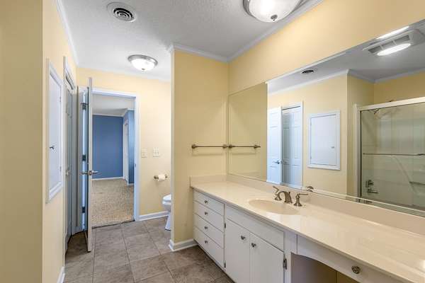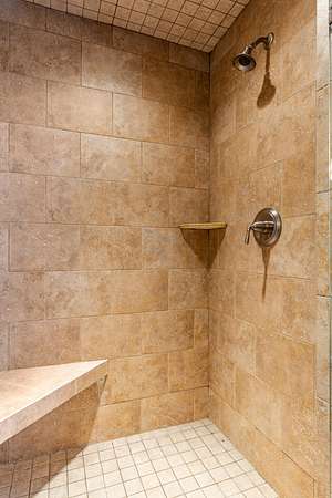 The primary suite serves as a private retreat, featuring an ensuite bathroom complete with a large soaking tub, a spacious walk-in shower with a built-in seat, and generous space designed for relaxation. Each additional bedroom also includes built-in shelving and its own ensuite bathroom, offering comfort and privacy for family members or guests alike.