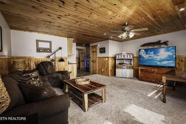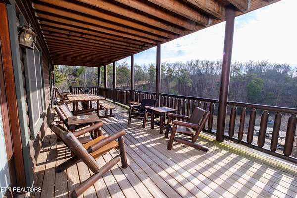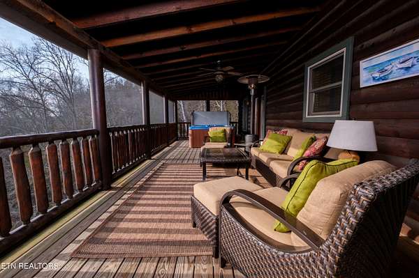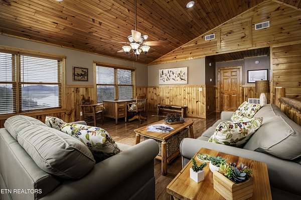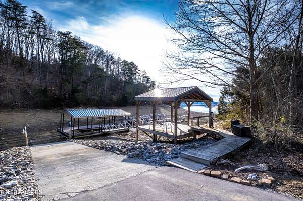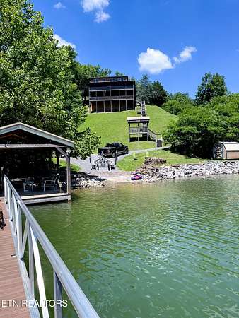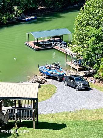 Very private, custom D-log home with many upgrades and breathtaking views of the main channel. The long private cove has no other boat docks nearby and has a boat ramp that offers walk-in access to the lake for swimming, tubing or paddle-boarding. Three stories of immaculately maintained, updated and carefully decorated living space. The owners have never lived here full time but have used it as a family retreat. The main level has a gas burning, stone fireplace in the living room and hardwood floors throughout. This level also includes a dining area, counter top eating in the kitchen with stools, and the master bedroom has a bath with a jacuzzi tub. Walk out on the main level deck for fantastic views and enjoy the hot tub. The second story has an oversized loft that could be used as an office, extra living room or game/play area. This level also includes two bedrooms each with their own full bath. The lower level is set up for entertaining with a wet bar and large open room. This space could be used as family or guest quarters as it also has a full bath and separate entrance off the lower deck. The oversized garage has areas for storage, workbenches and a place for the golf cart that comes with the property. A privately paved road goes to the water's edge where you will find a fire pit, storage shed, large boat ramp for easy boat launching, and a custom-built covered deck platform with furniture included. The ramp to the new, covered boat slip is just steps away. A move-in ready property, set up to enjoy all the lake has to offer.