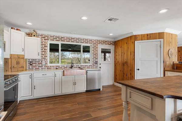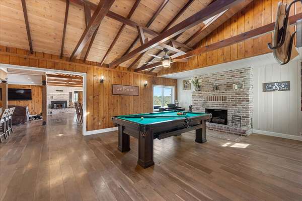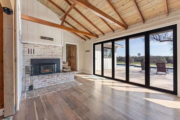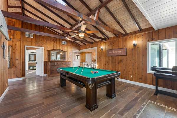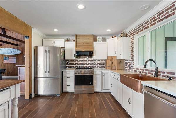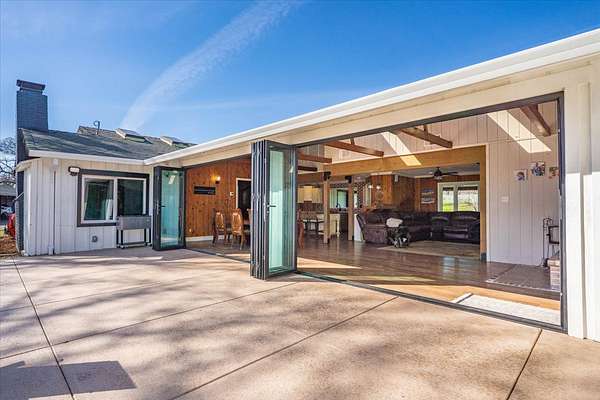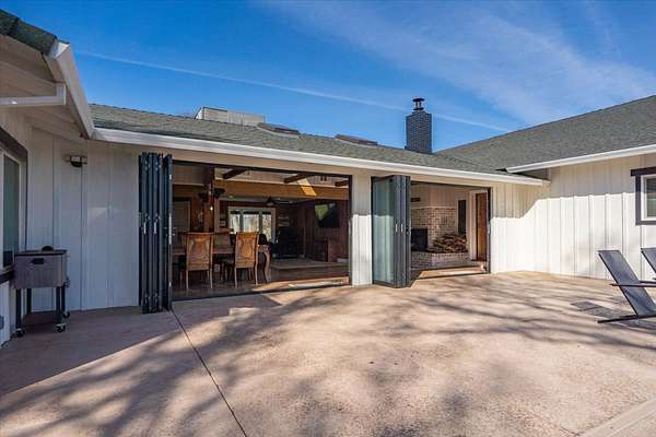 - GREAT ROOM: Large open room. Includes kitchen, dining area, and lounge. Newer stainless appliances, including refrigerator, range, built-in microwave, dishwasher, and copper farm sink. Farm-style free-standing island. Large pantry and door to back yard. This area offers amazing bi-fold windows and doors, opening to a partially covered and open patio around the inground pool with an upper heated spa. Wood stove insert in raised brick hearth. Guest bath off lounge area.